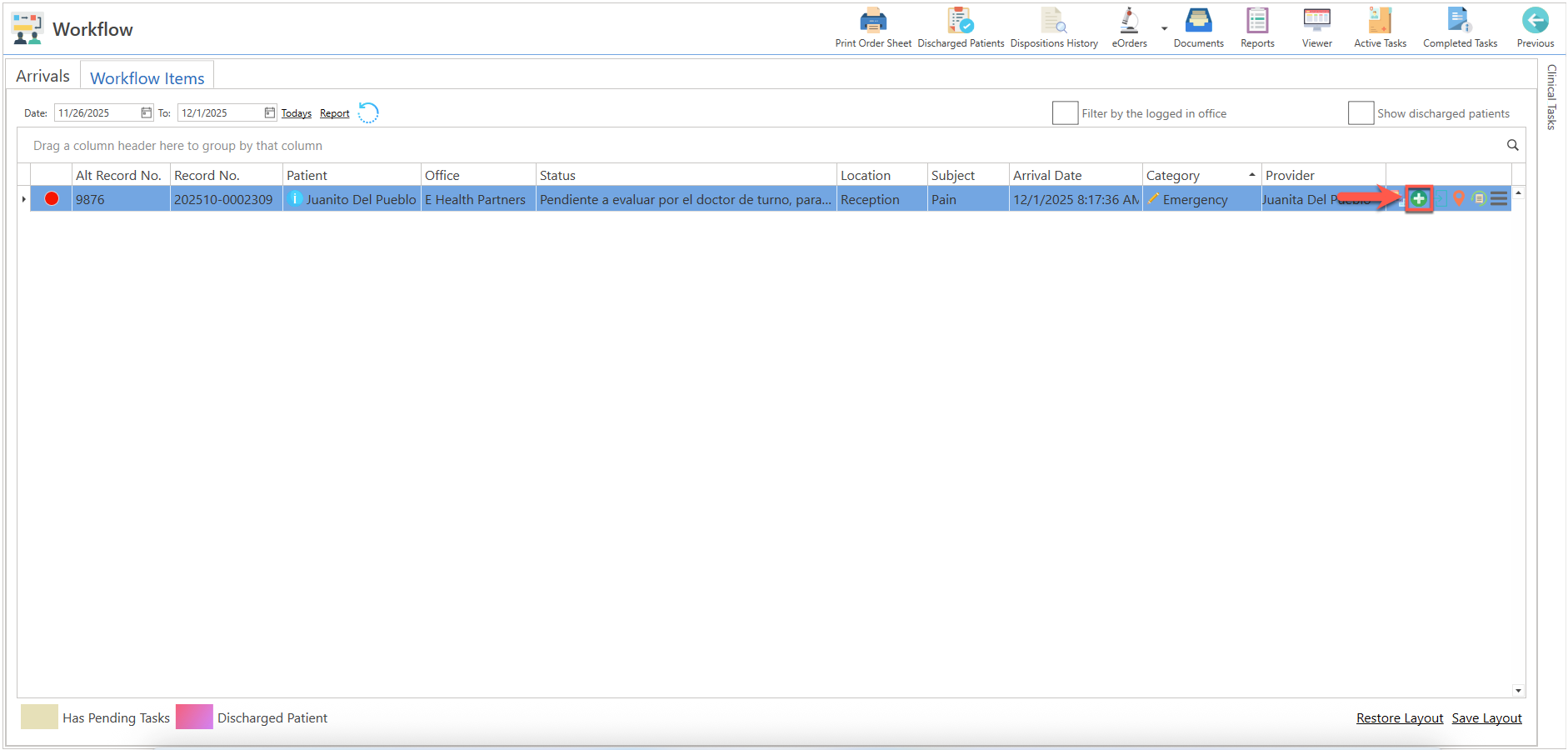Las tareas clínicas que se asignan, serán solamente visualizadas en la pantalla de "Tasks", que se accede desde la pantalla de "Workflow". Estas tareas, se deben se completadas, antes que el paciente se vaya de la oficina médica.