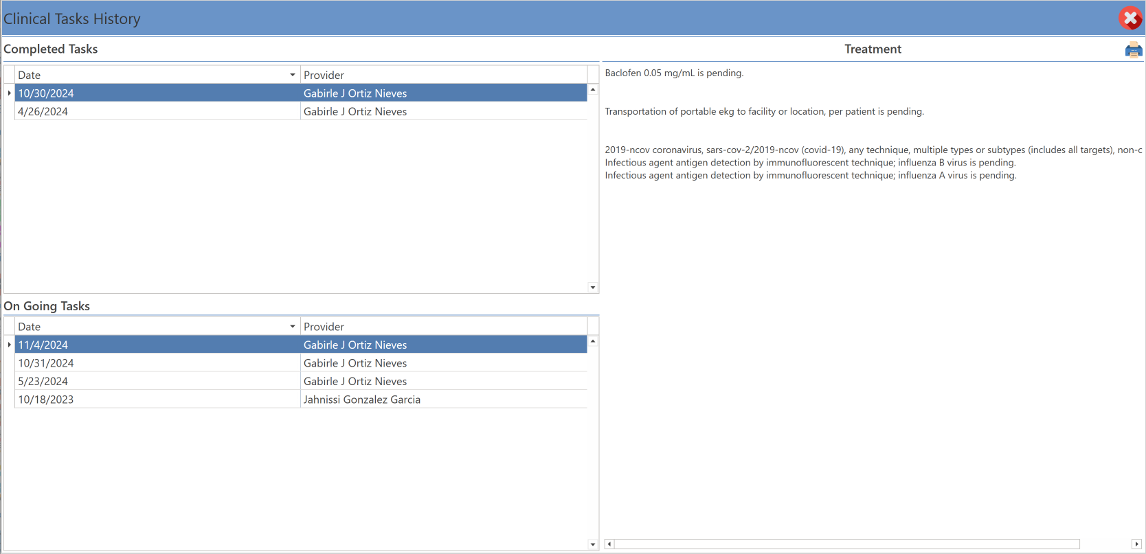 - On Going Tasks: Section where the list of pending clinical tasks will be displayed. By selecting them, the detail will be displayed in the Treatment section.