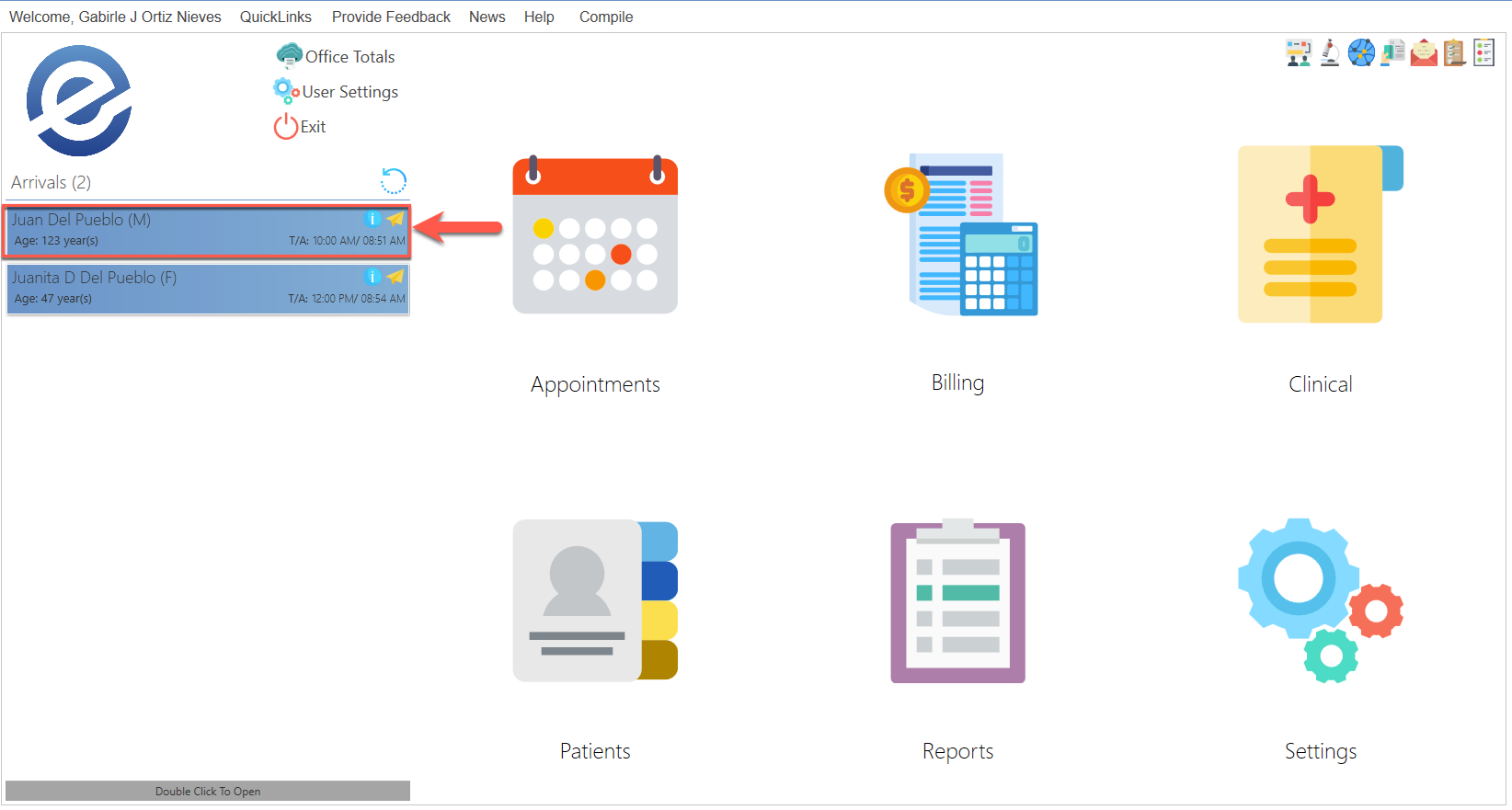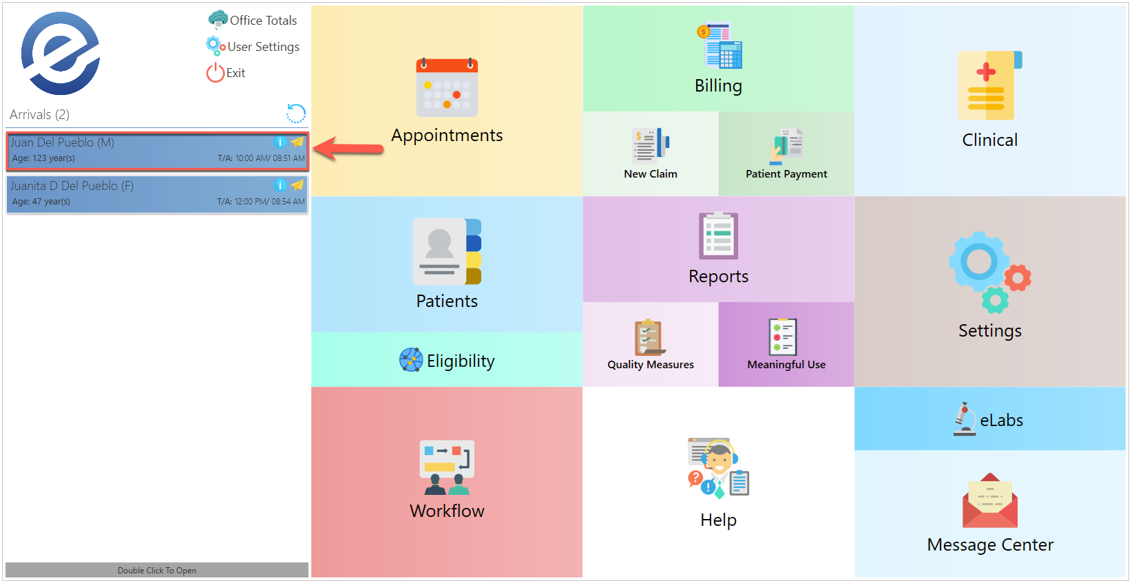 Patients who are registered as arrived in the Appointment screen will be displayed on the main menu.