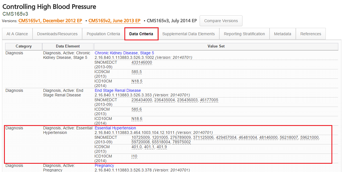 - Press the Diagnosis link, Active: Essential Hypertension, this will take you to the specific screen where the information that user registered in program is detailed. For this example, you must enter any code that applies from list (ICD9 = 401.0, 401.1, 401.9) o (ICD10 = I10)