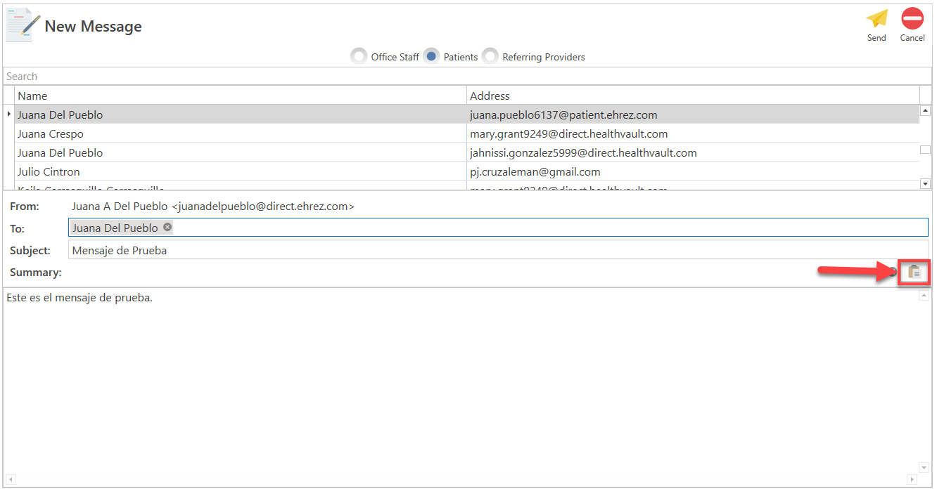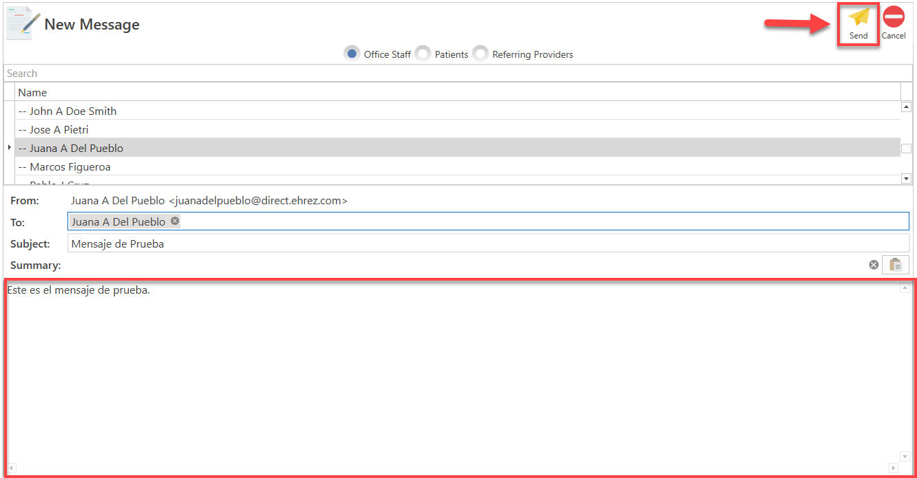 - Draft your message to the specified office staff member, and once finished, click the Send button situated in the top right corner of the screen.