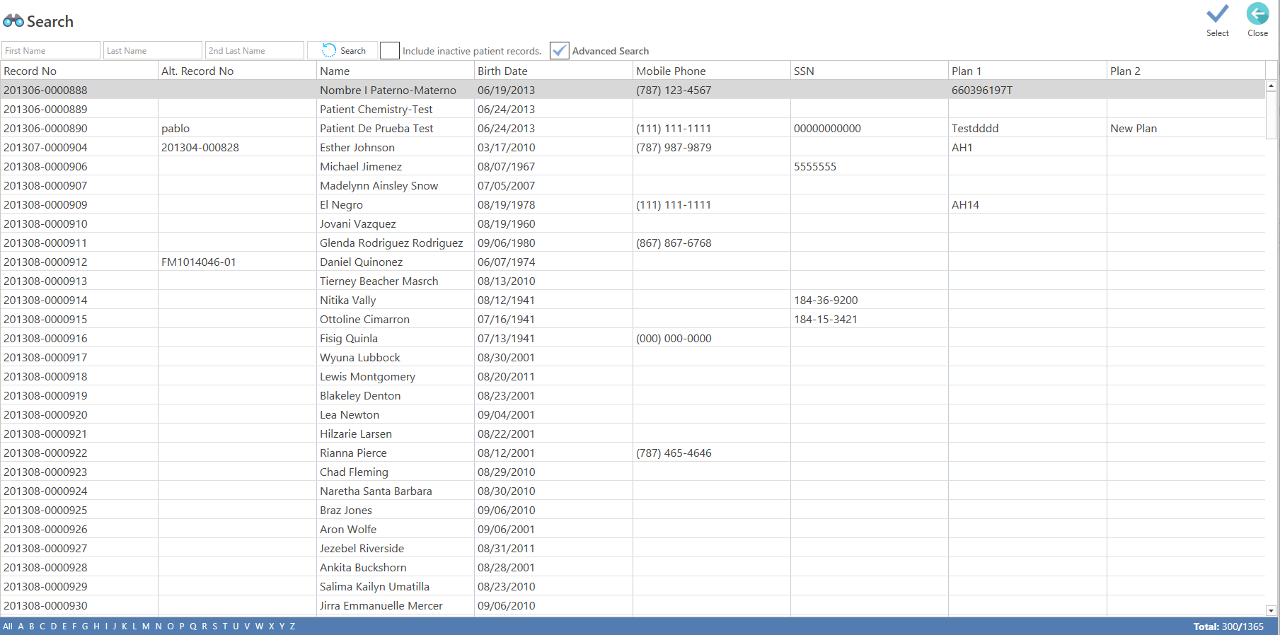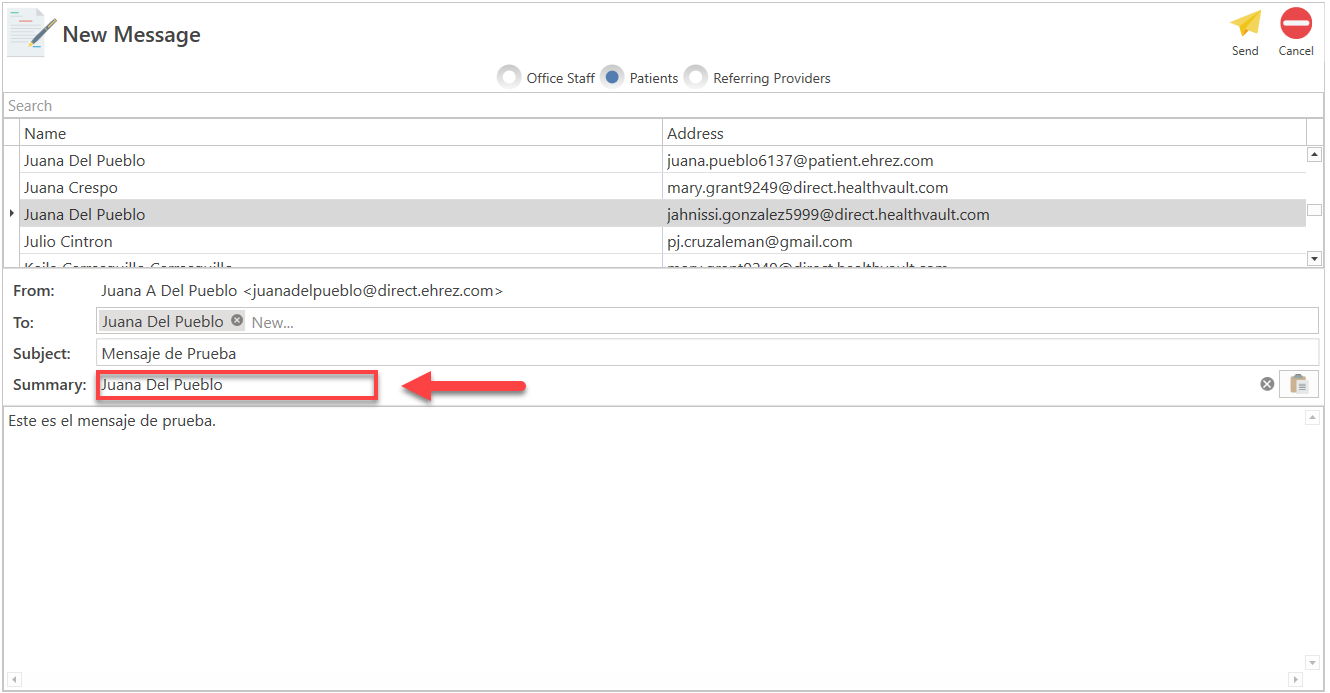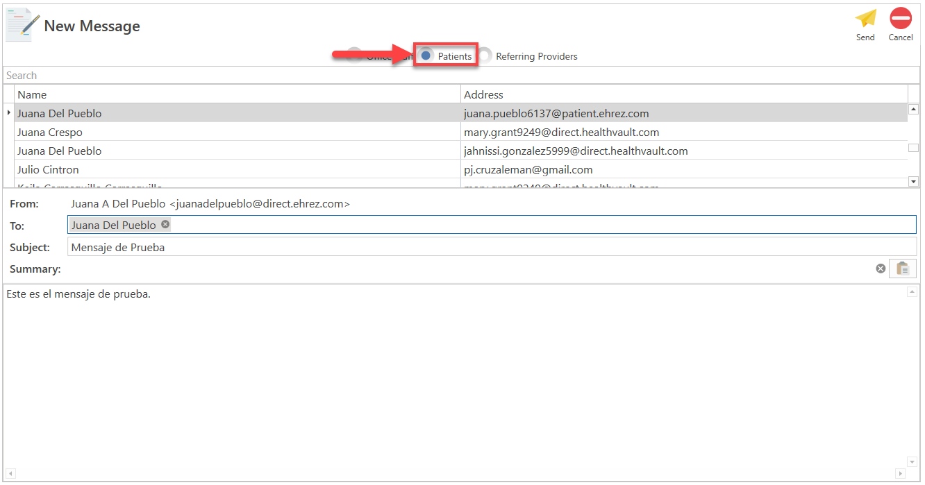 - To send a message to a patient, search for their name and click the Select button at the top of the screen, or you can double-click on the patient's name.