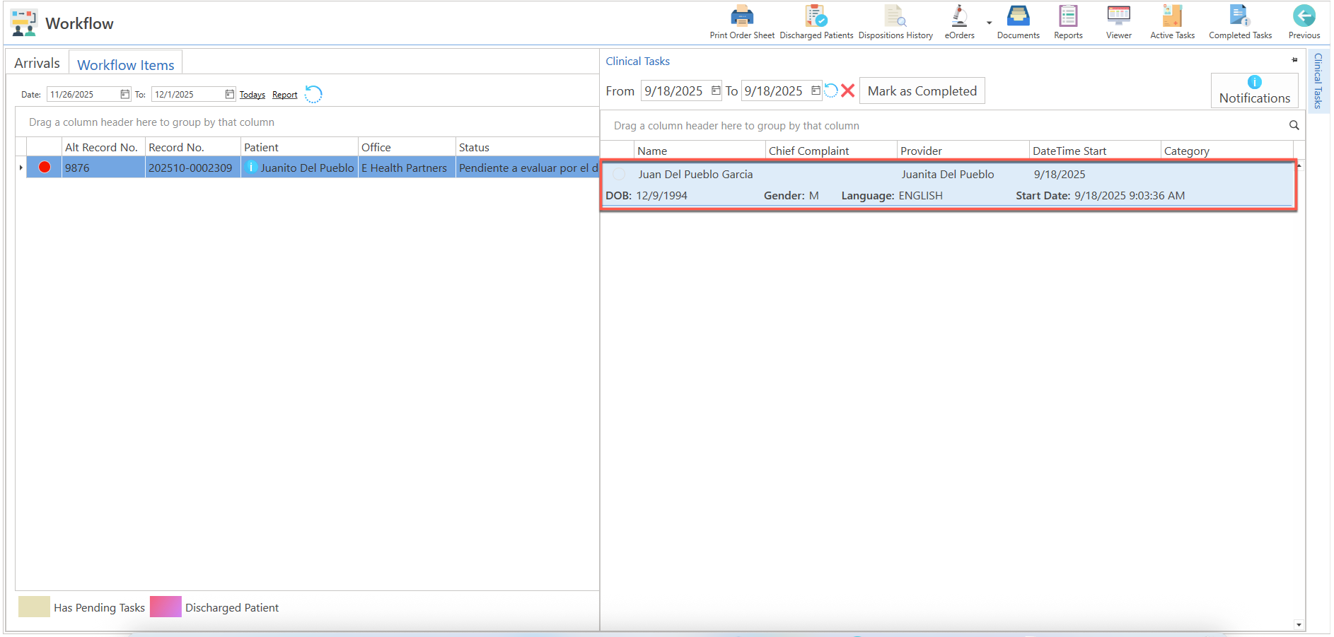 - Proceda a abrir la nota del paciente que presente tareas clínicas pendientes asignadas.