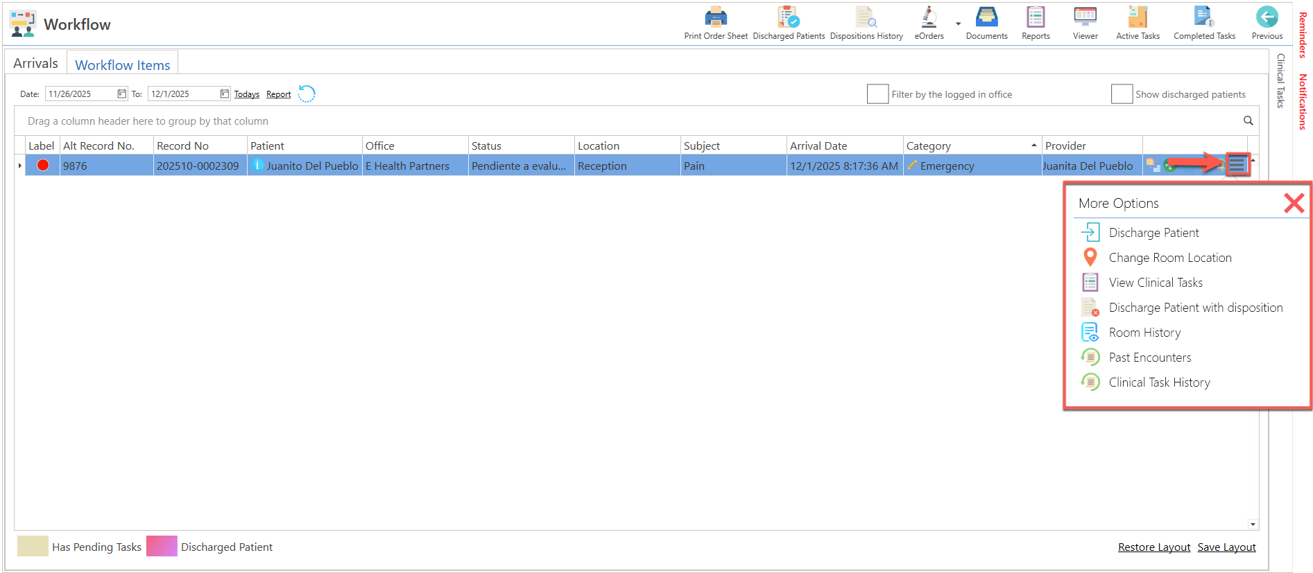 - Presione el botón de "More Options", localizado al final de la línea del paciente.
