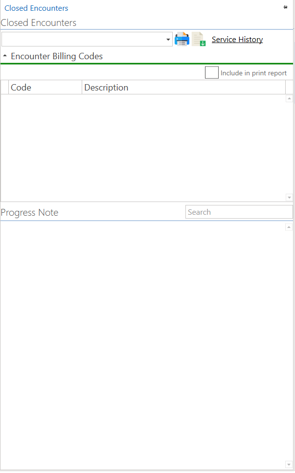 - [Closed Encounters Tab]: It displays all the patient's closed encounters where they can be viewed, downloaded and printed. It also has the Service History option, where it shows the history of the procedure codes and diagnoses used in the closed encounters.