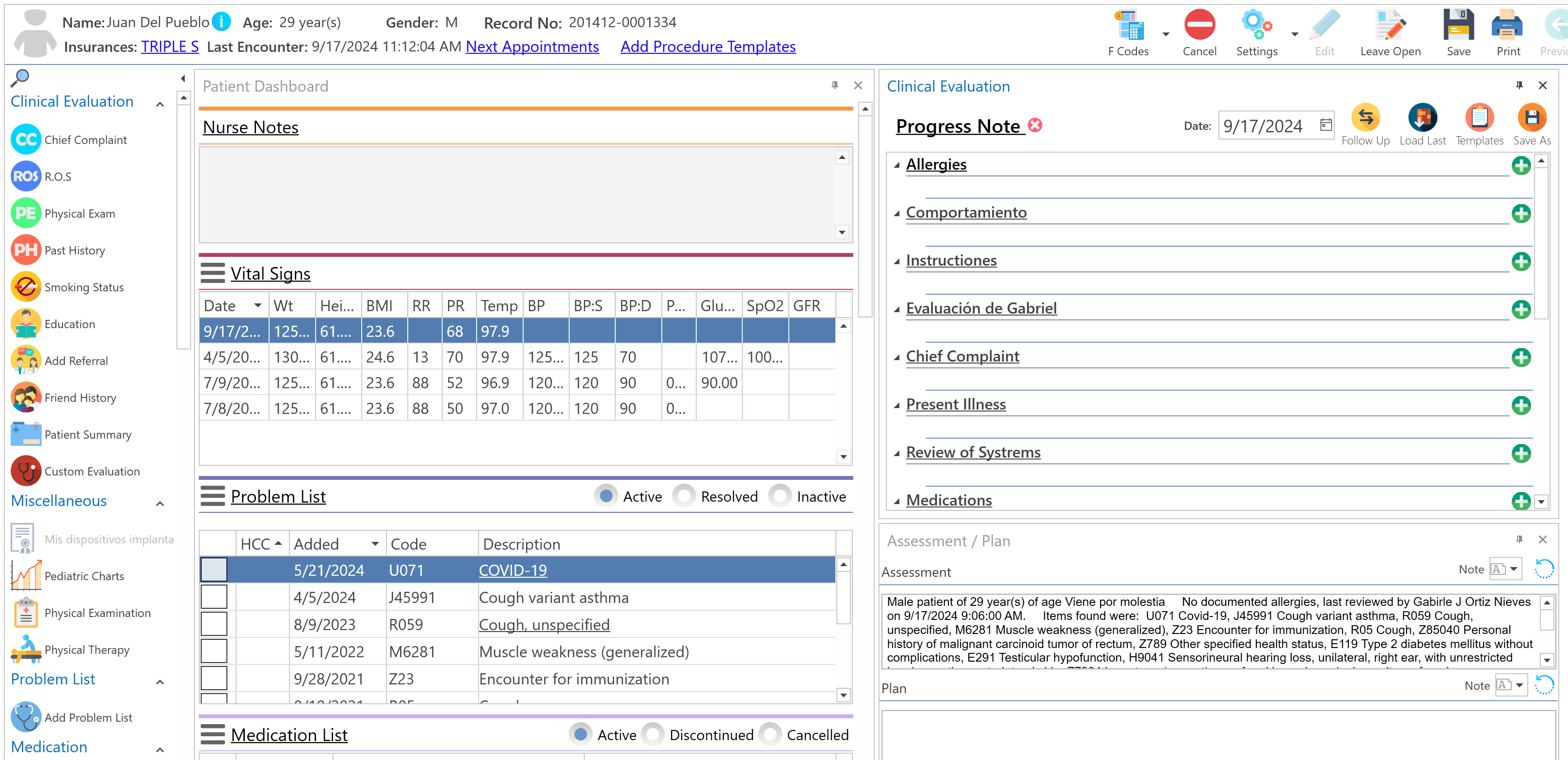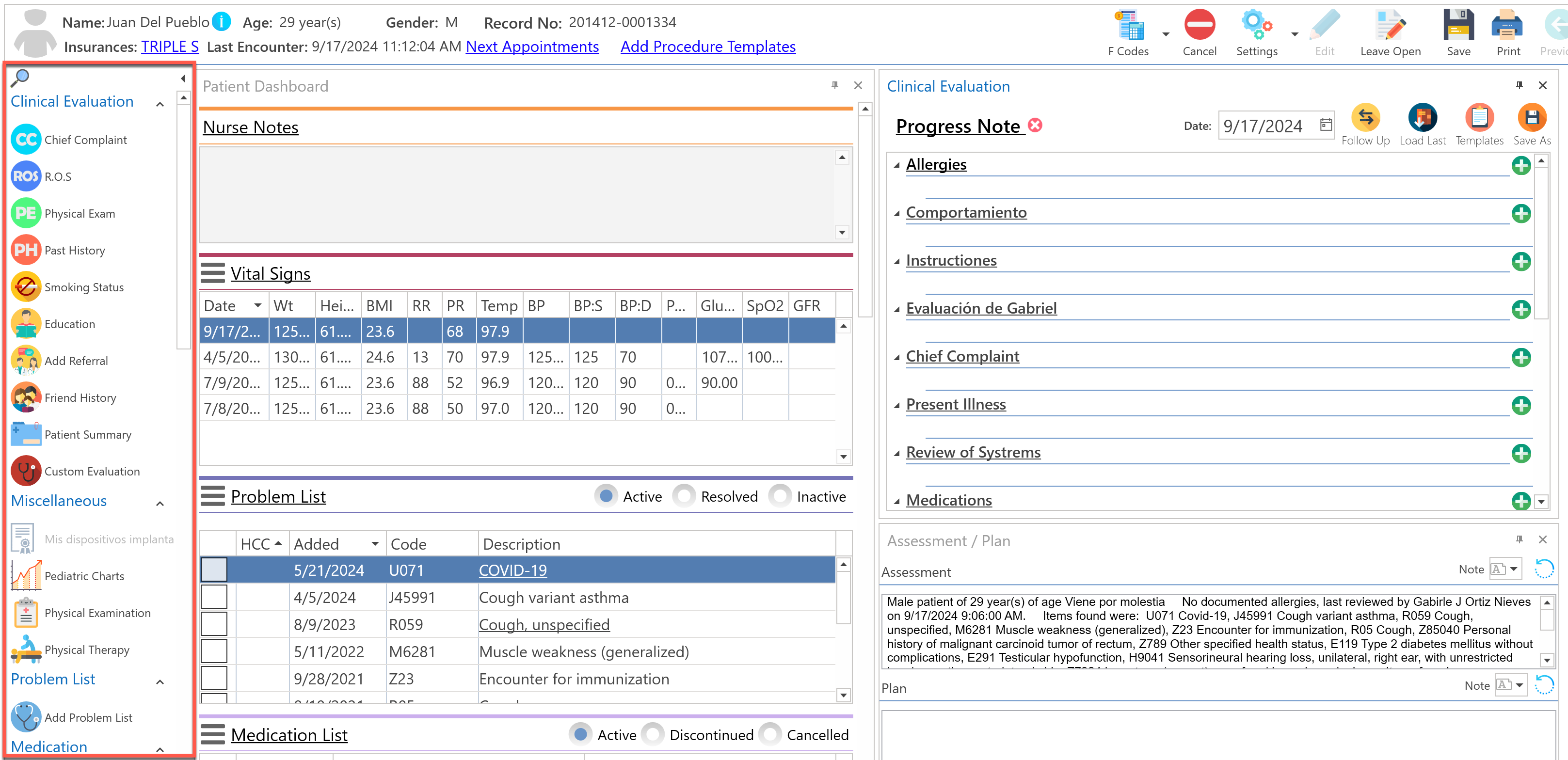 Main screen where the provider performs the patient's clinical evaluation. It can be customized according to the user's preference.