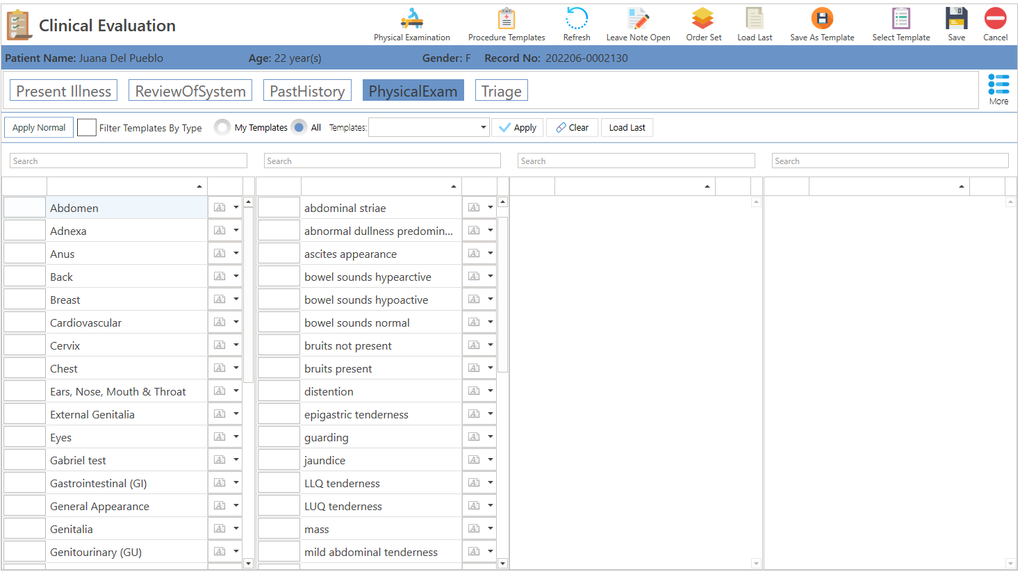 Physical Exam: Screen used to record information about the physical examination performed on the patient. Recommended Article: Advanced Progress Note / Physical Exam
