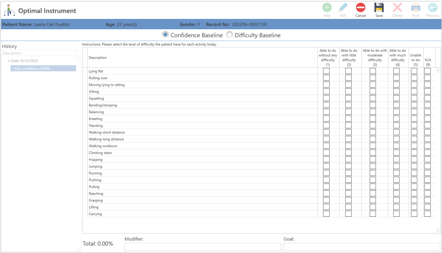 Optimal Instrument: A screen is utilized to conduct assessments of difficulty and confidence during a physical therapy evaluation or subsequent follow-ups. Recommended Article: Advanced Progress Note / Optimal Instrument