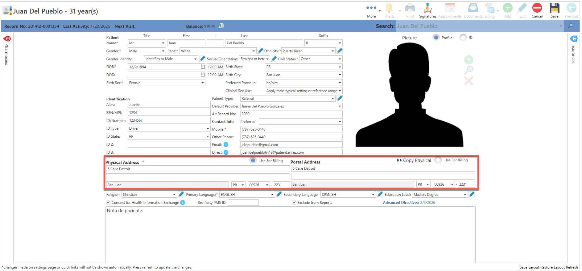 - Physical Address: *(Requerido) Dirección física del paciente.
