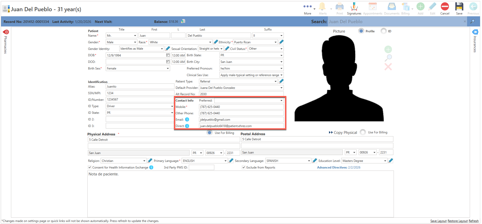 - Direct: Dirección, para enviar información clínica de una forma segura, conocida como dirección de "Direct". En nuestra aplicación, se utilizará la dirección del portal de EHP Patient Portal. Ejemplo:mary.grant7938@patient.ehrez.com)