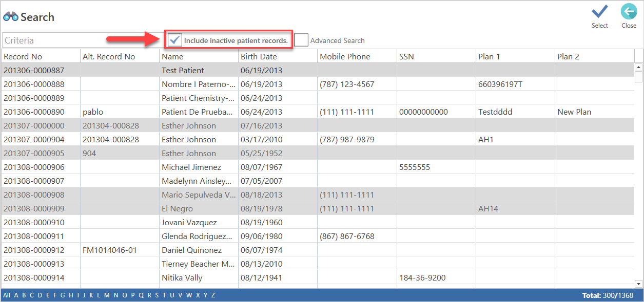- Choose the option to include inactive patient records.