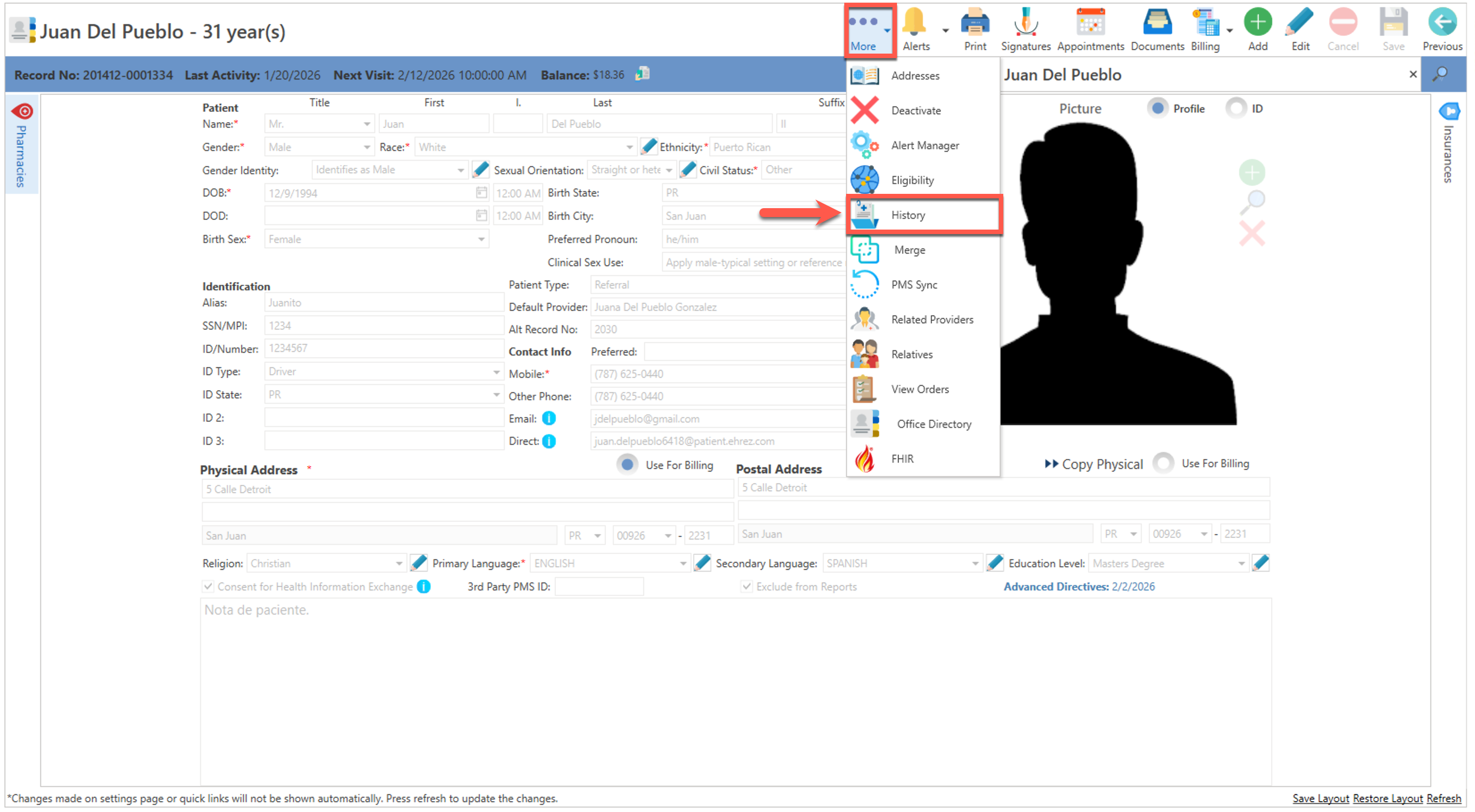 Hay varias opciones para ver el historial de cambios en el récord y el envío de correos electrónicos de un paciente.