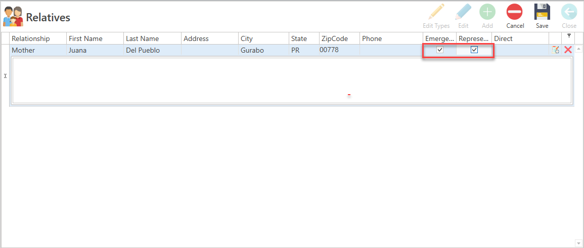 - Select the checkboxes to identify the family member or relative as an emergency contact or representative.