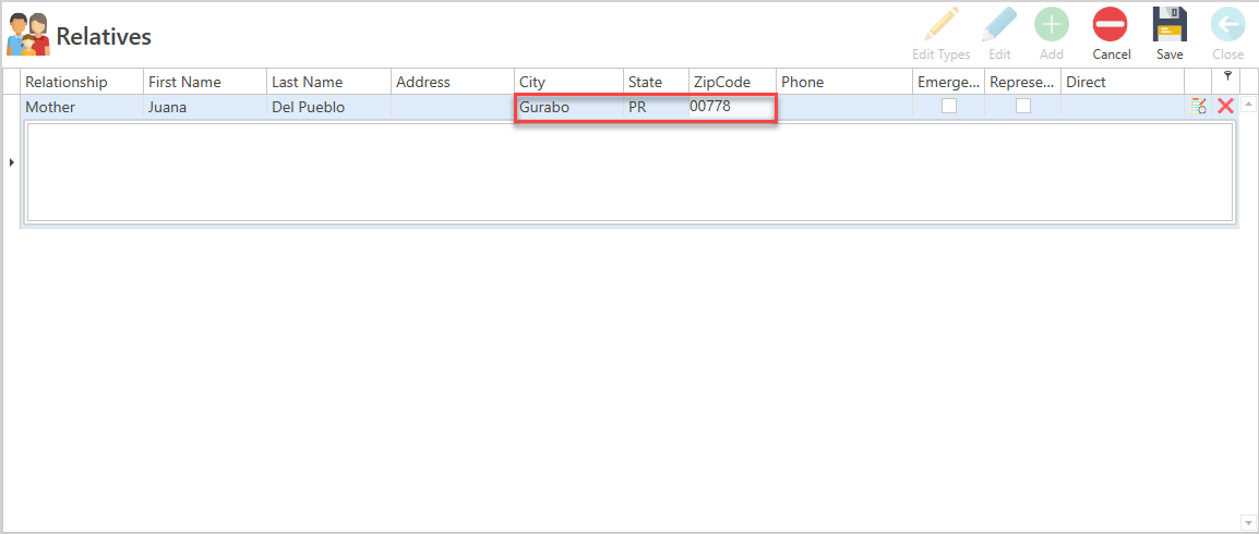 - Once the patient's family member or relative has completed the information, press the Save button located at the top of the screen.