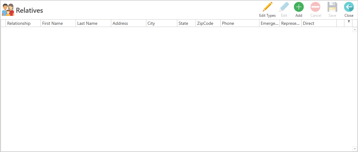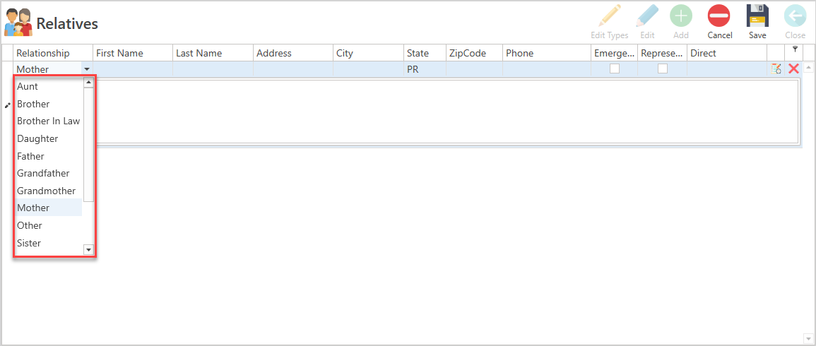 - From the Relationship list, select which relationship the family member or relative has with the patient, other than the one displayed by Default, as configured.