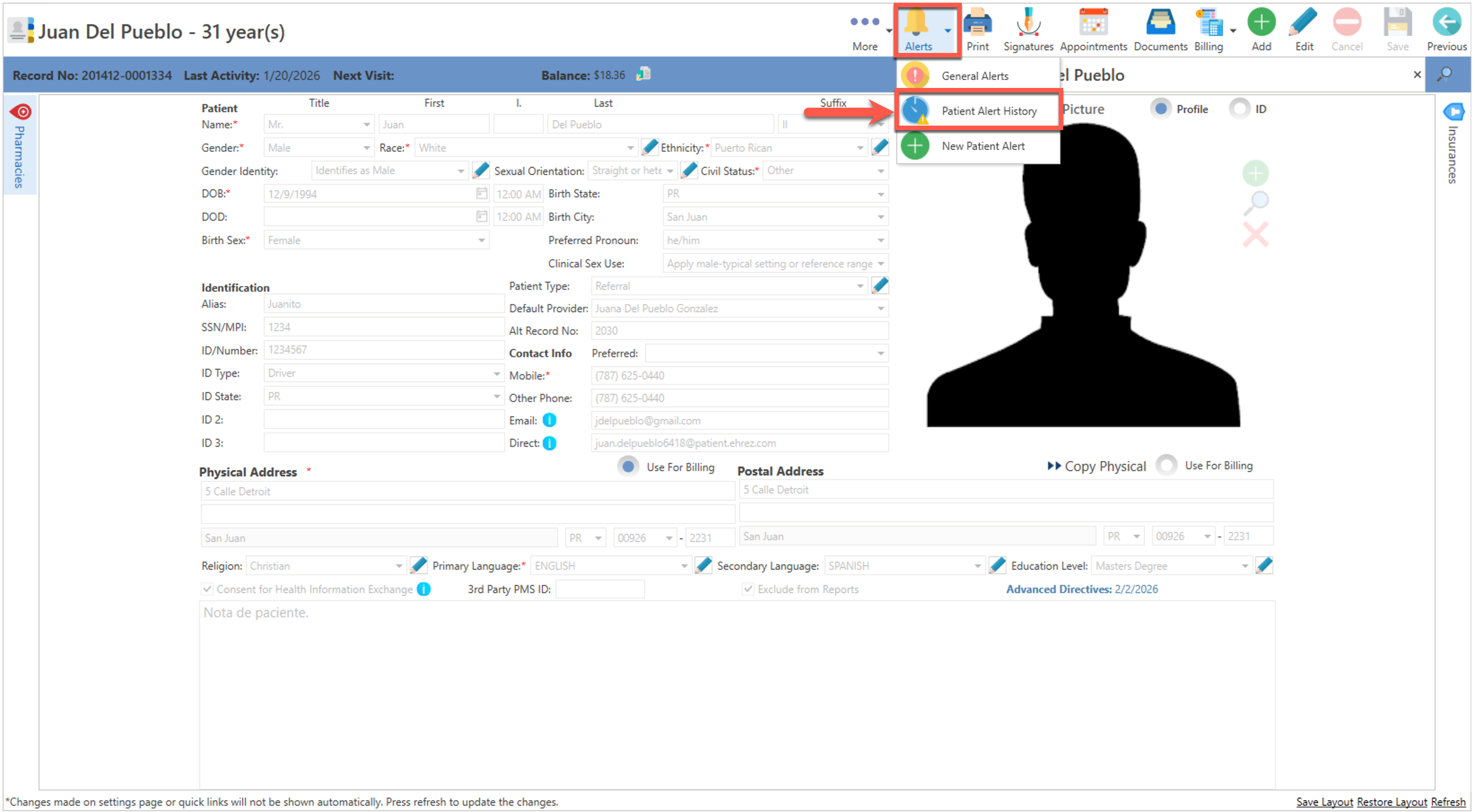 Si desea ver las alertas administrativas y clínicas del paciente, diríjase a la pantalla demográfica del paciente.