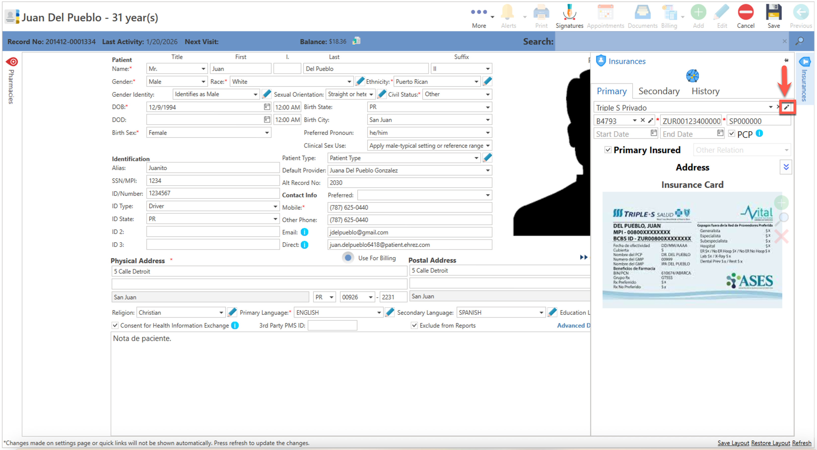- Seleccione la compañía que acaba de agregar y complete toda la información necesaria, sobre la cubierta de seguro del paciente.