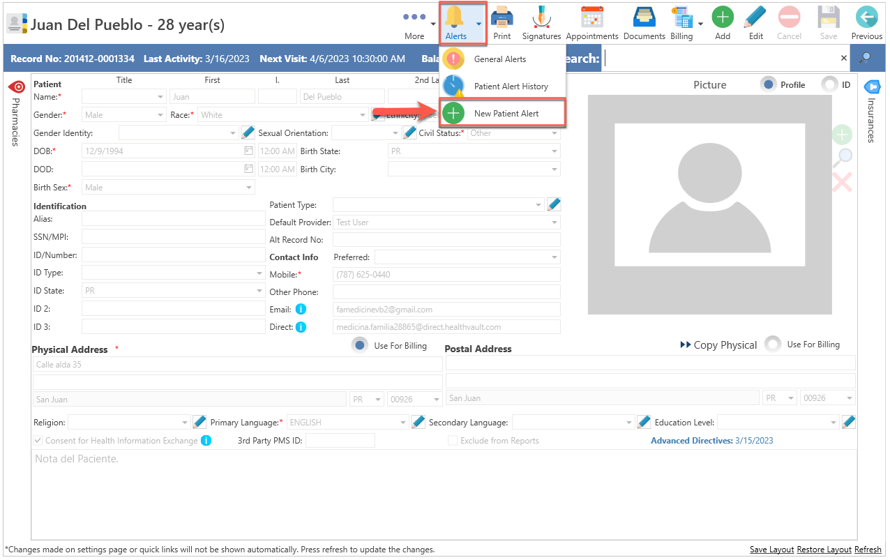 - Perform the search and select the patient for whom you want to create the administrative or clinical alert.