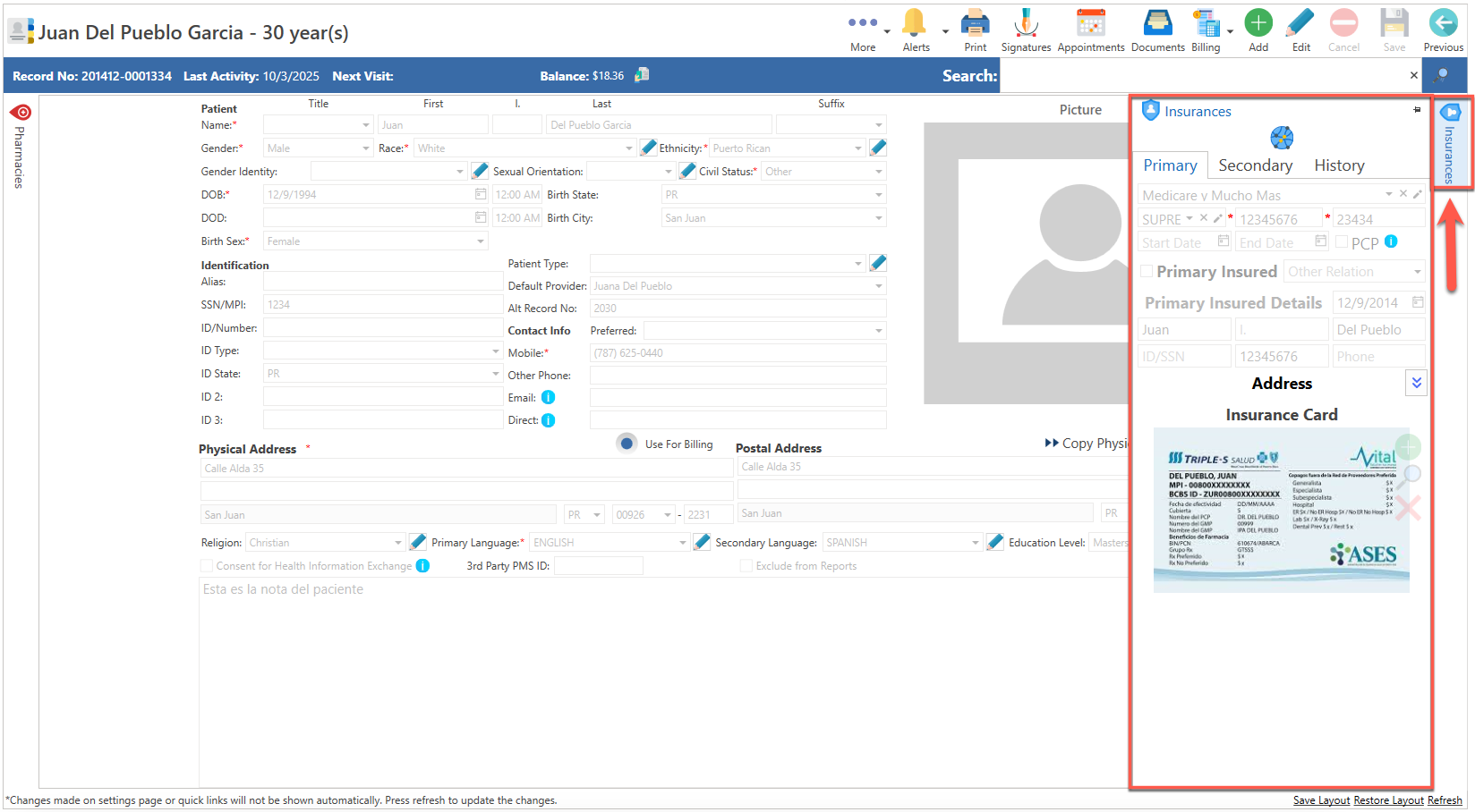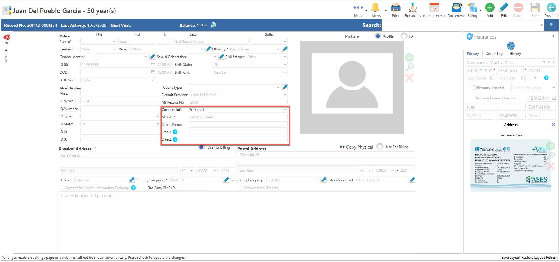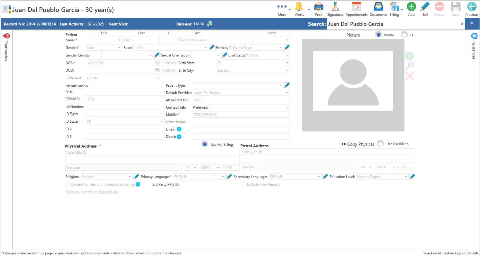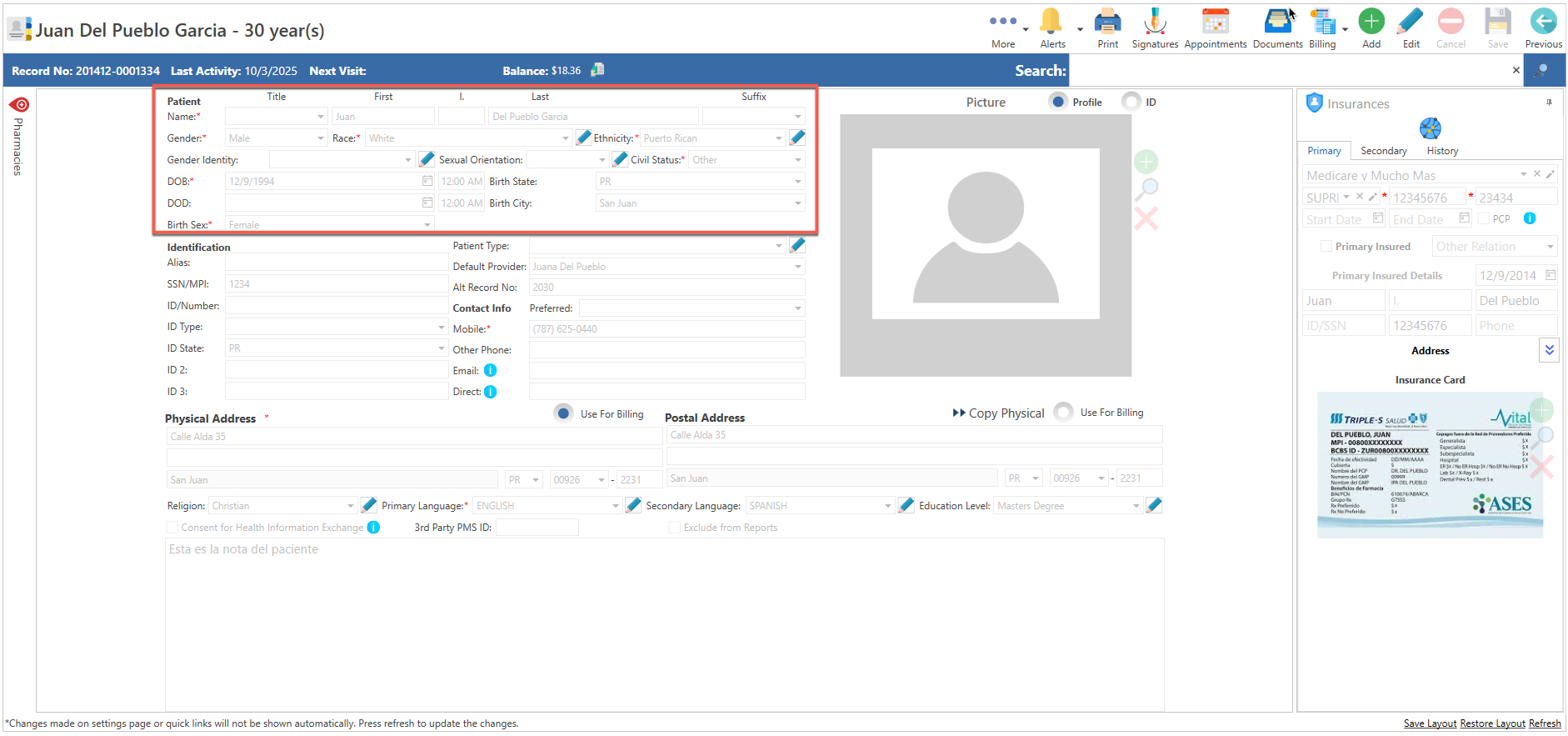 Pantalla donde se registra y edita, la información demográfica de los pacientes. En la misma, se pueden realizar múltiples funciones como: imprimir el reporte demográfico, registrar la firma, si el paciente llega a la oficina o sala de emergencia, acceder a la pantalla de citas, registrar documentos, acceder a la pantalla de facturación, registrar pagos, ver el historial de pagos e imprimir reporte, de los compras de productos, entre otros.