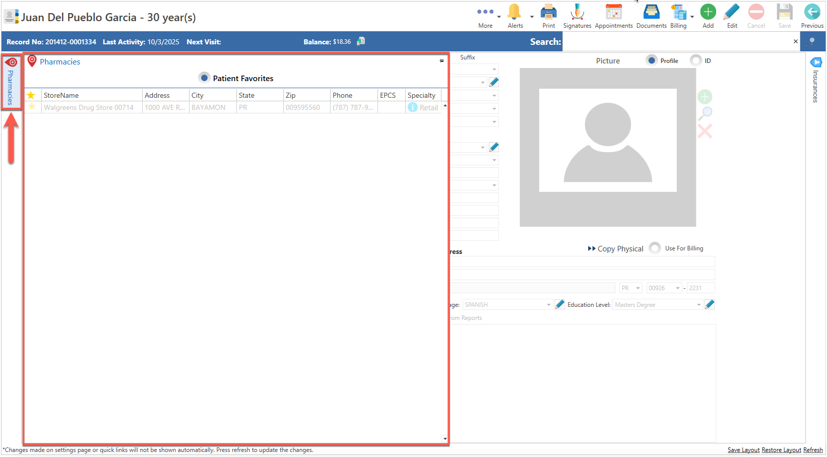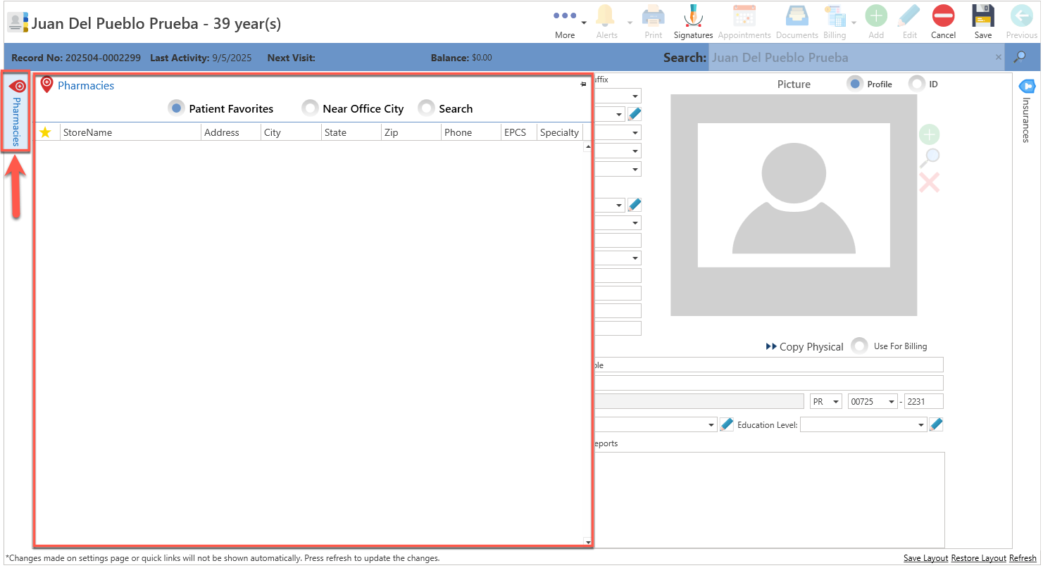 - Insurances: Al presionar esta pestaña, se desplegará sección para registrar las farmacias favoritas del paciente.