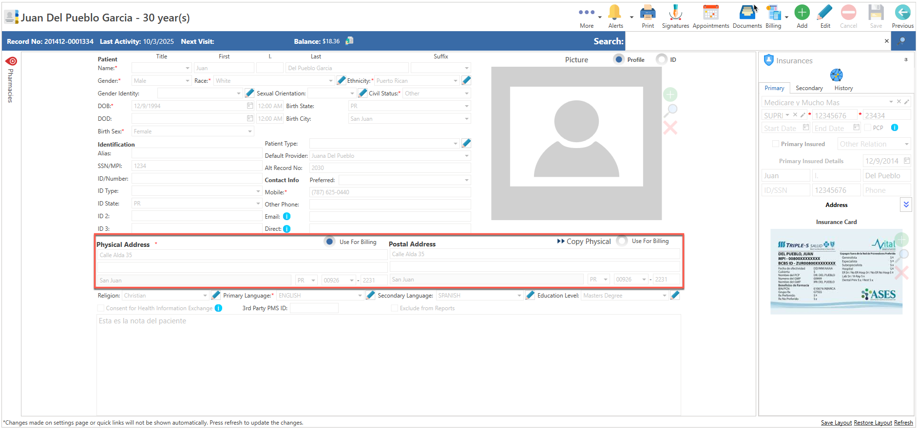 - Postal Address: Dirección postal del paciente o presione el botón llamado "Copy Physical", para copiar la dirección física, en los campos de la dirección postal.