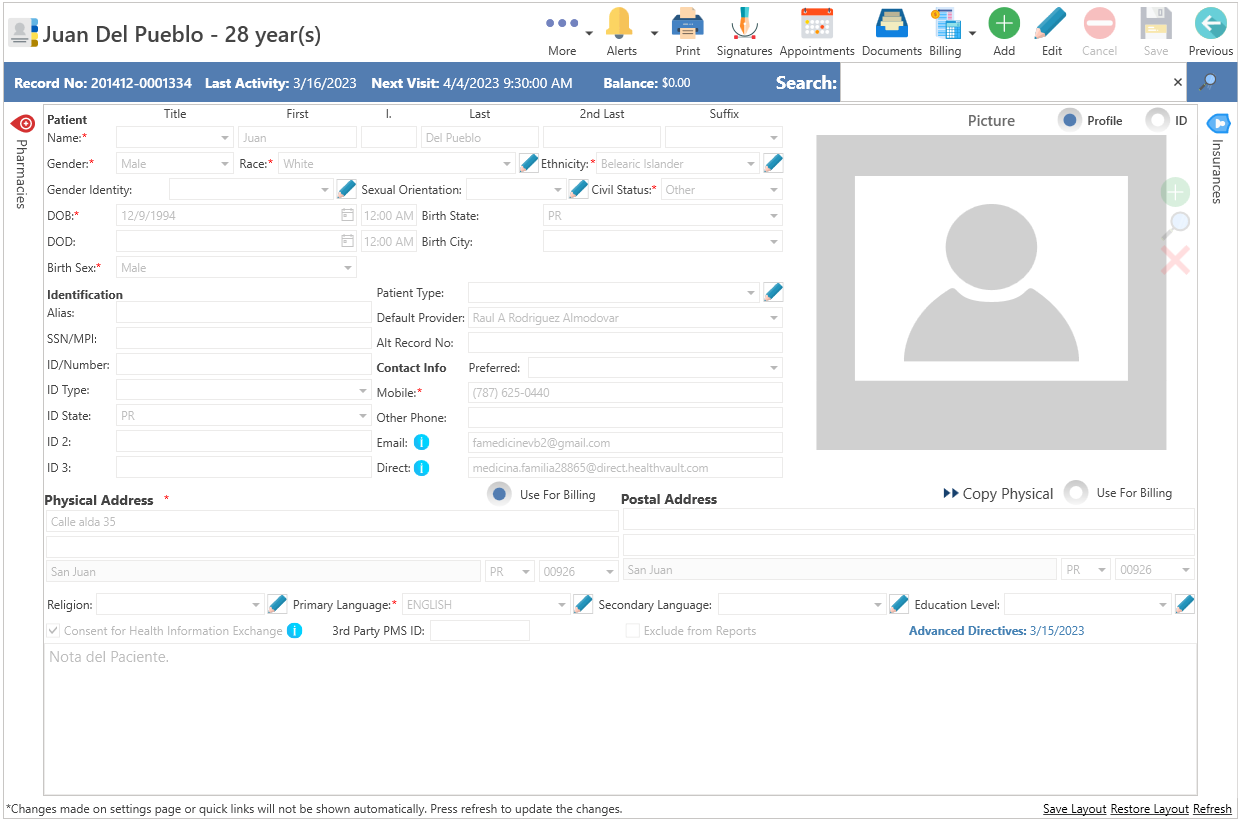 - Patient Detail: The system displays the demographic screen for the selected patient. If no patient is selected, the screen will appear without information.