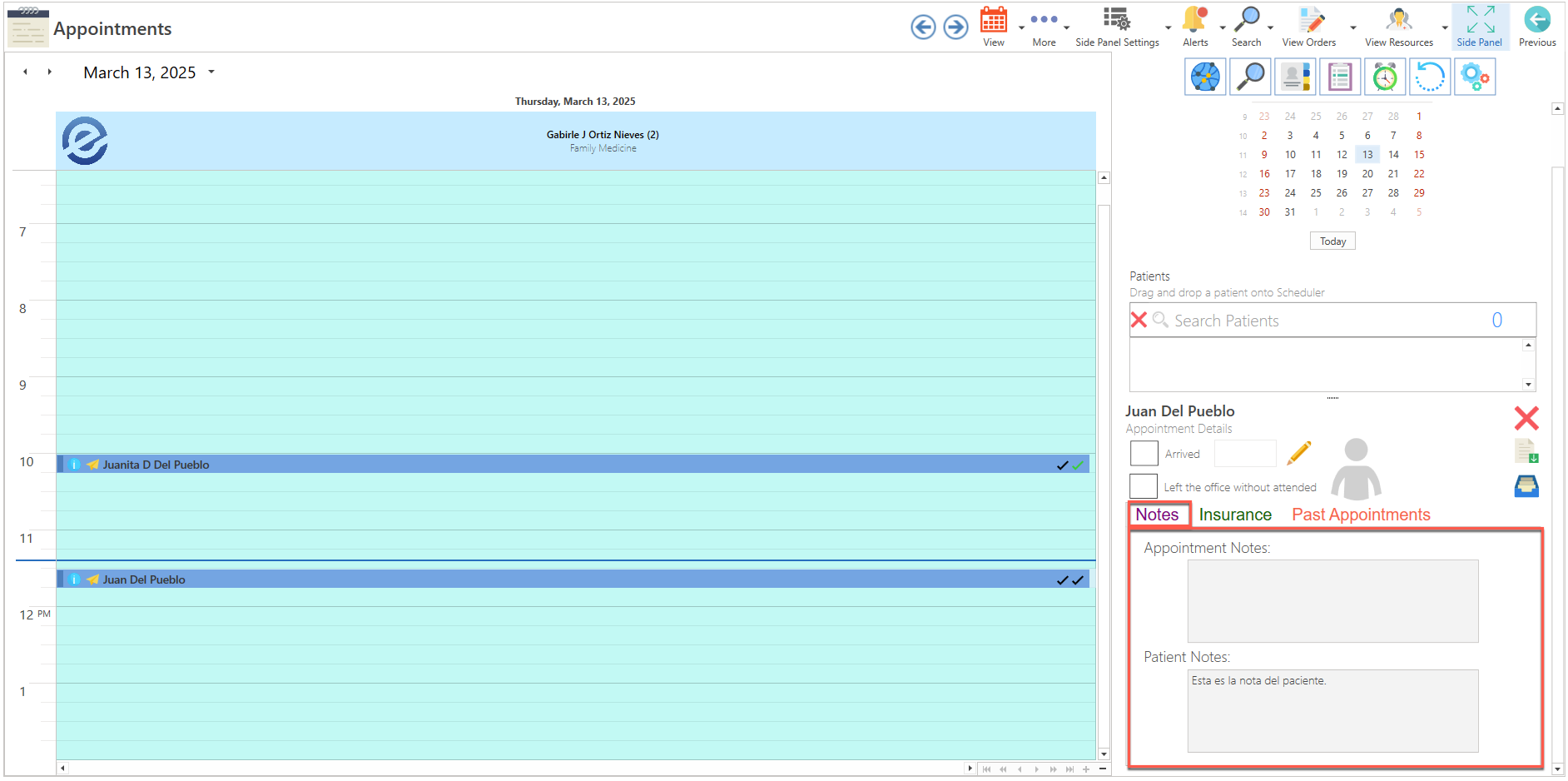 - Notes: Displays the appointment notes and the notes created on the Patient Details screen for the selected patient.
