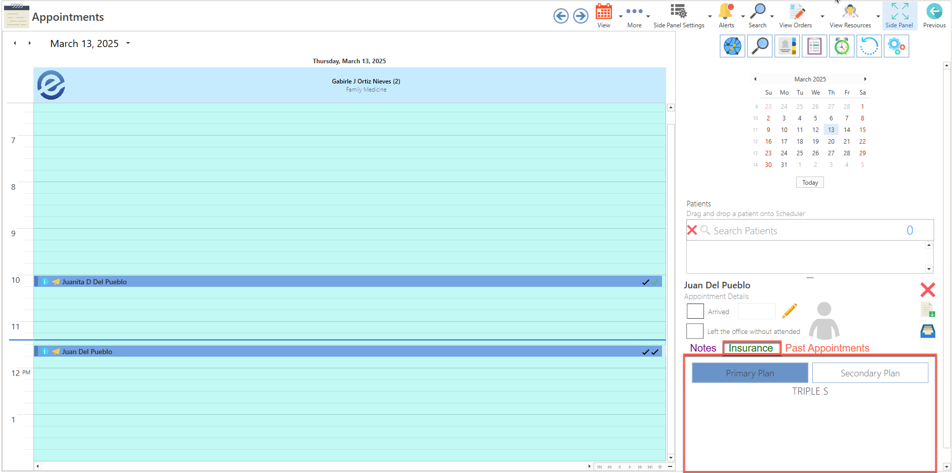 - Insurance: Displays the image of the primary and/or secondary medical plan for the selected patient.