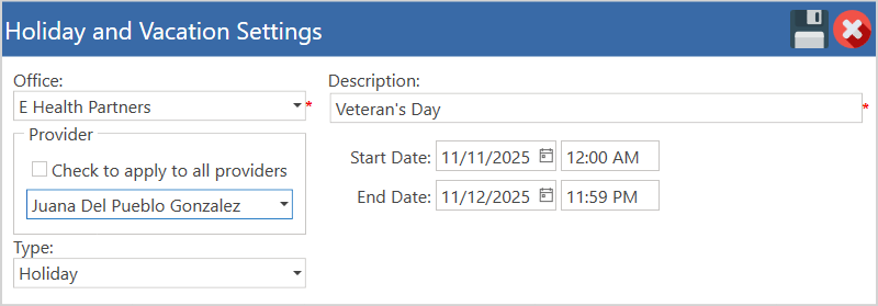 - Add Hol.: Permite configurar los días feriados y vacaciones de los proveedores y de la oficina o centro.