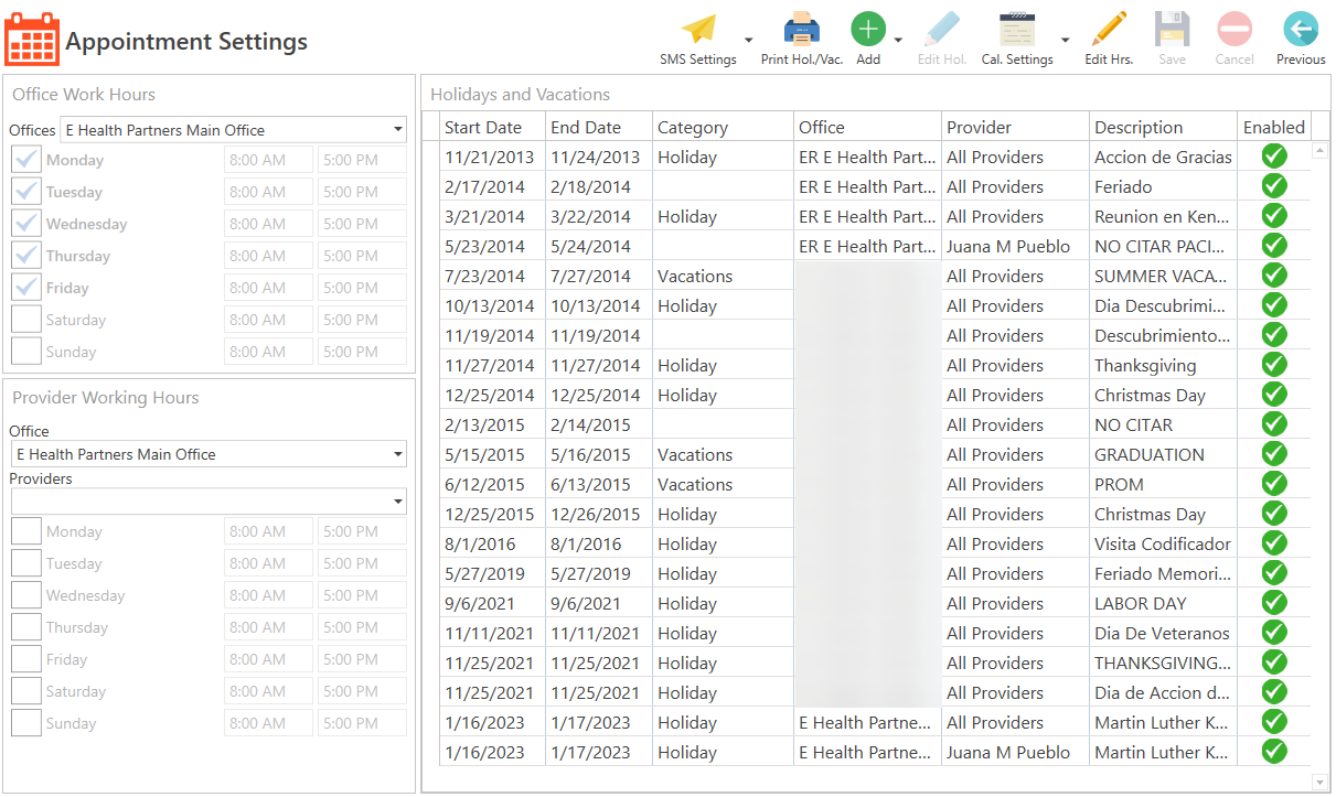 Used to configure office or staff hours, holidays, appointment types, and evaluation rooms.