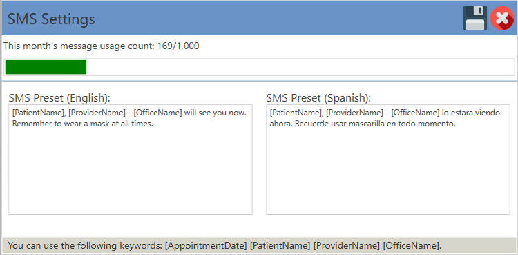 - SMS Settings: The system enables the configuration of text messages to remind patients of their appointments. Additionally, it allows the creation of Templates to simplify the process of sending text messages from the office or facility.