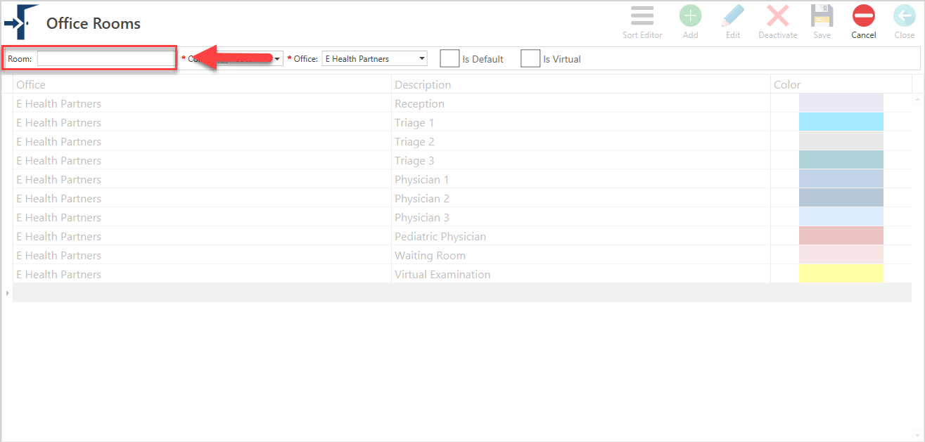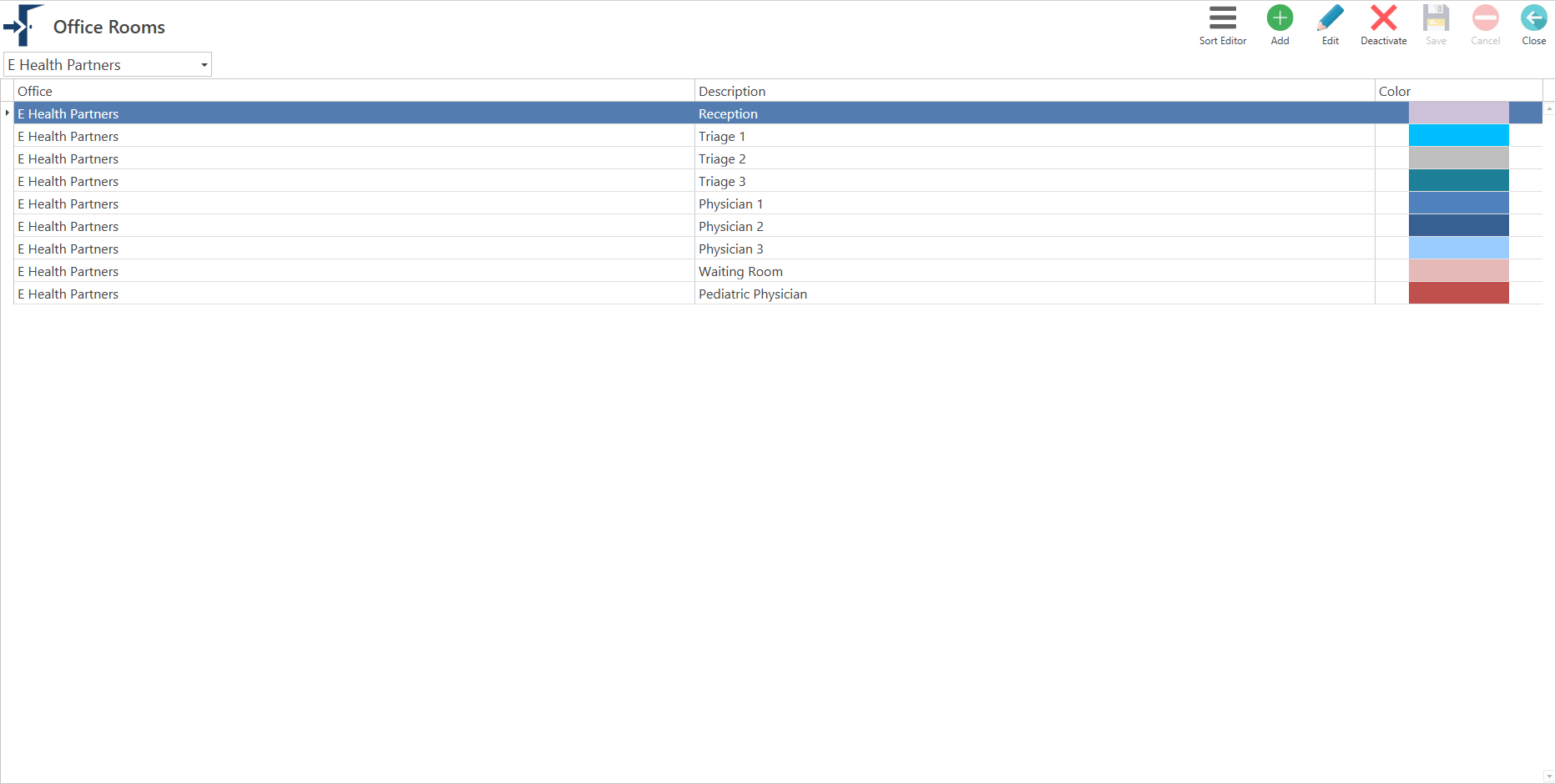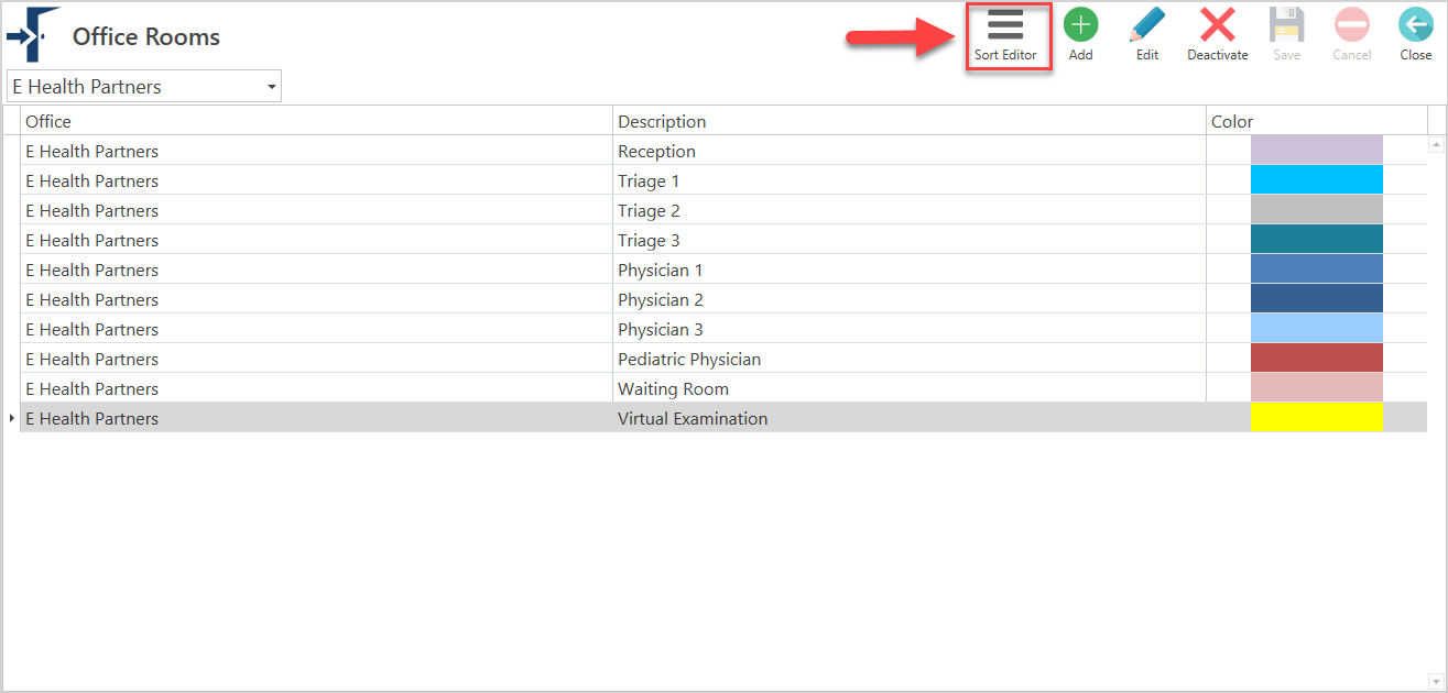 - To arrange the office or center evaluation rooms as per your preference, click on the Sort Editor button situated at the top of the screen.