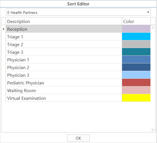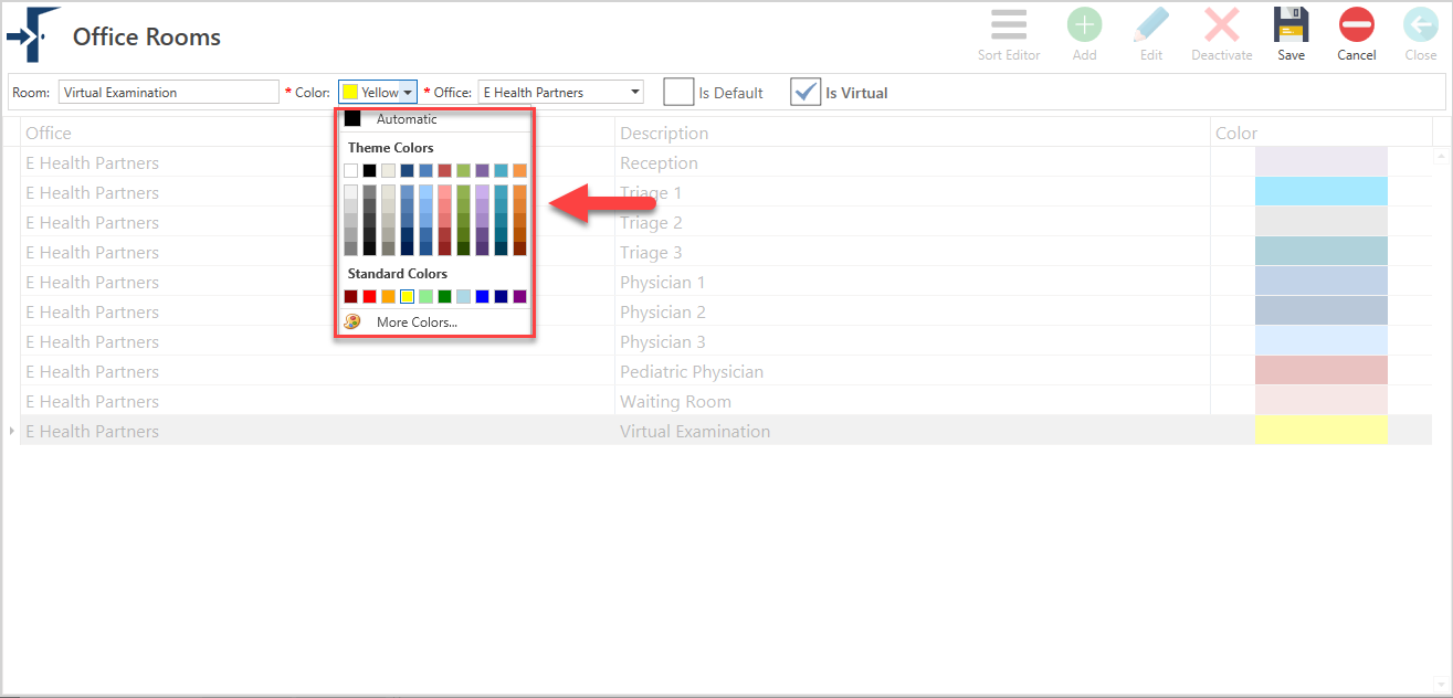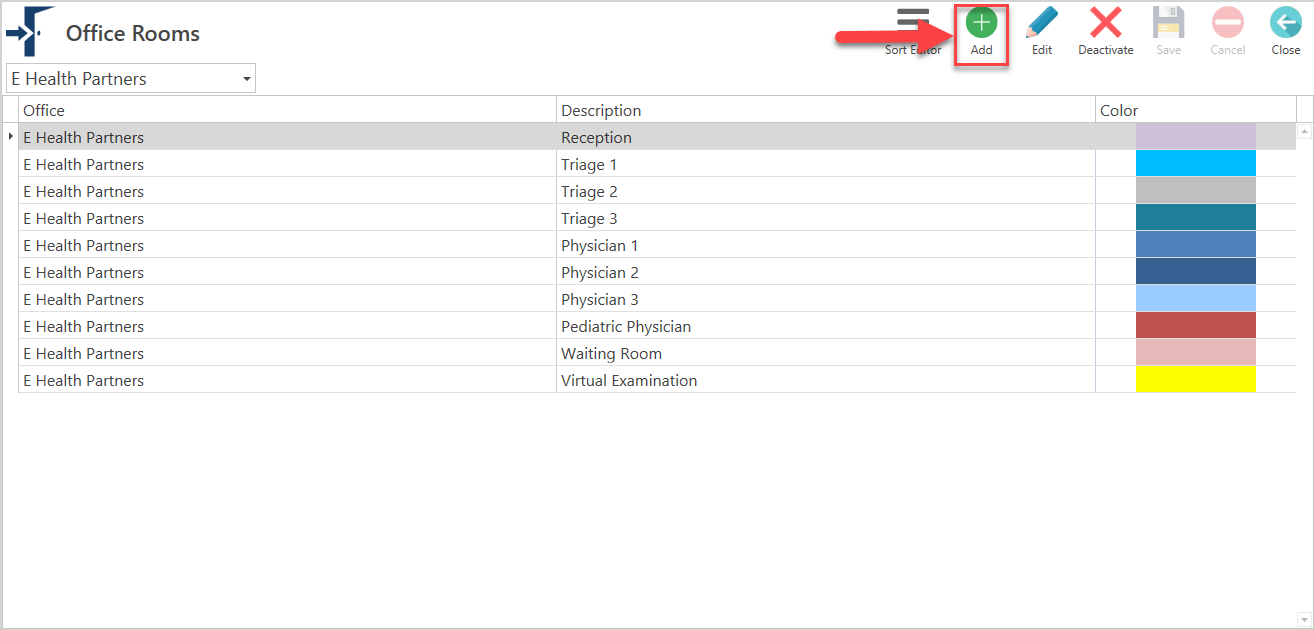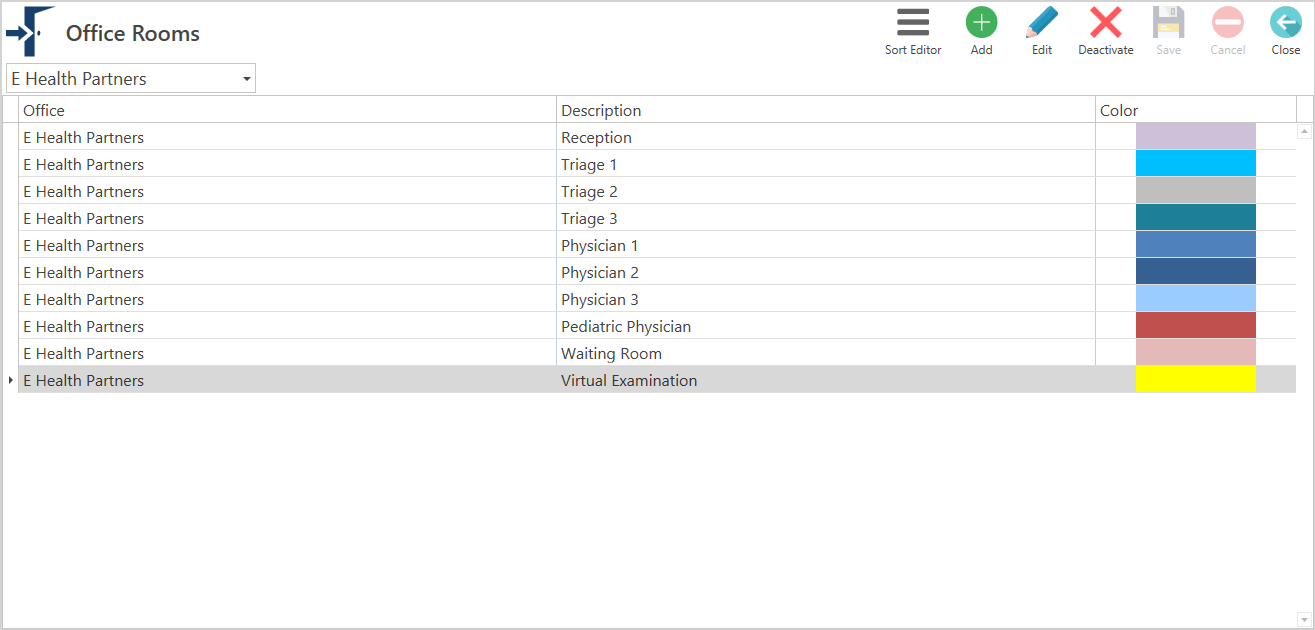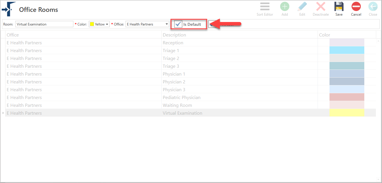 - To arrange the office or center evaluation rooms as per your preference, click on the Sort Editor button situated at the top of the screen.
