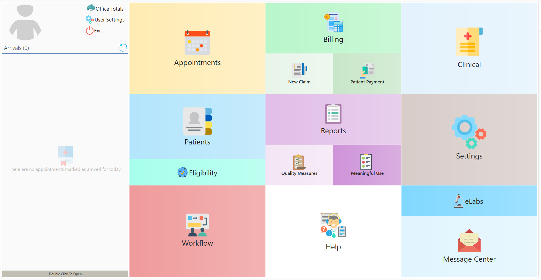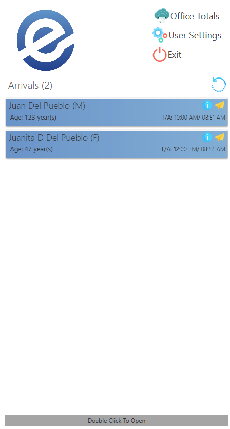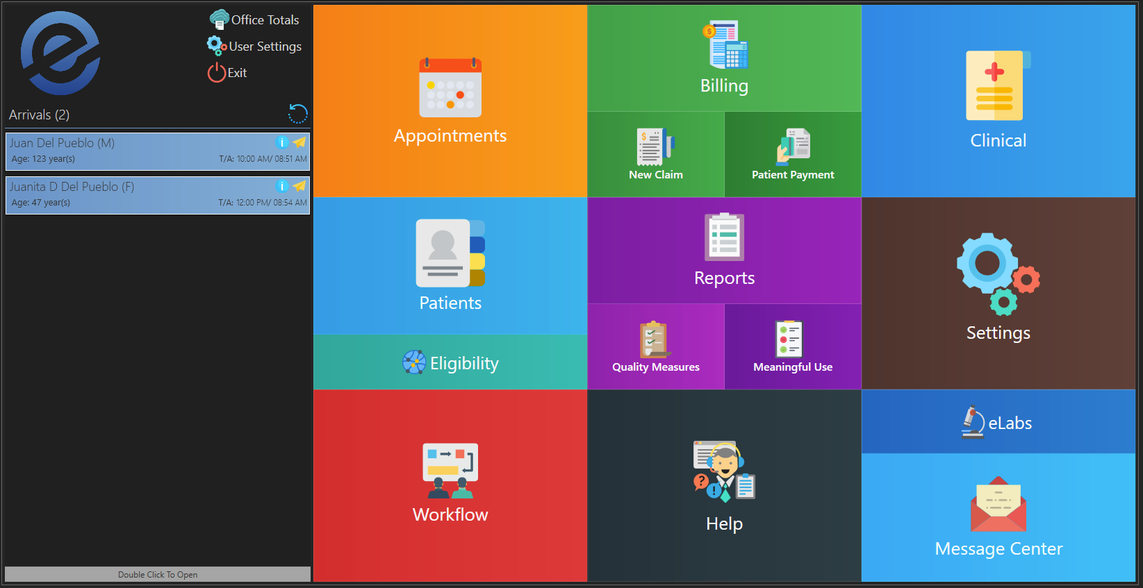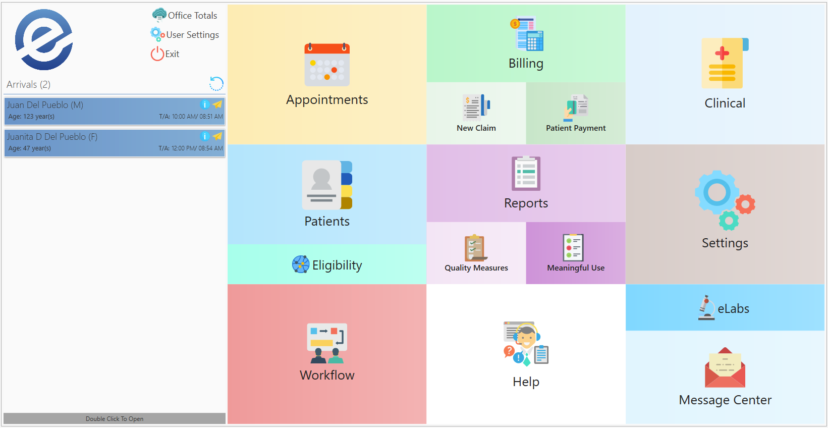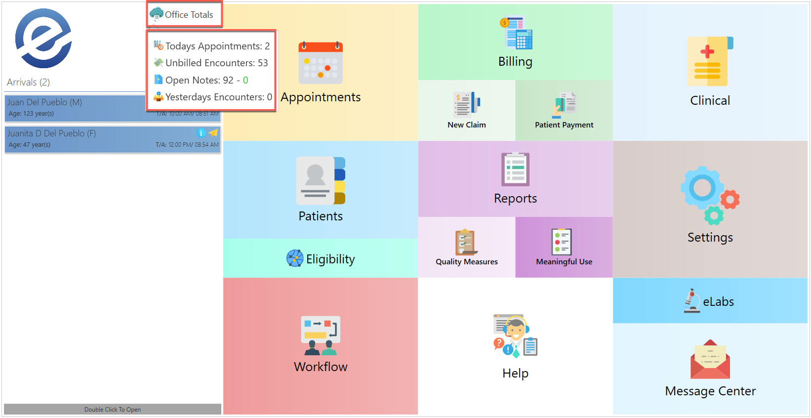 Office Totals: Al presionar, se muestran los totales de citas, encuentros no facturados, notas abiertas y los encuentros del día anterior.