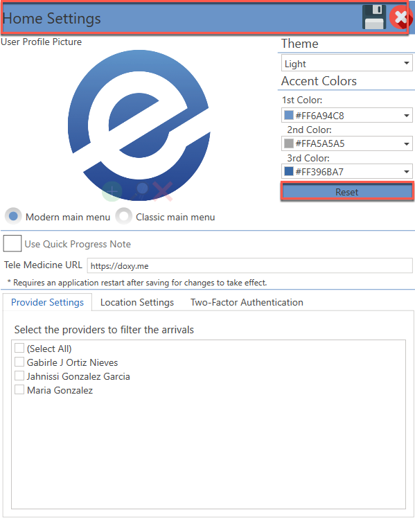 Provider Settings: Se mostrará la lista de proveedores activos. Al seleccionar un proveedor mediante el "Check mark", se desplegarán los pacientes asignados a dicho proveedor en la lista de la sección "Arrivals". Además, se actualizará la sección de "Today's Patient" en la pantalla de "Clinical Records".