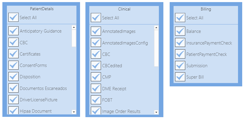 - To display all patient documents, check that all categories in the Patient Details, Clinical and Billing sections are selected. If the screen is displayed from the Patients screen, only the options in the Patient Details section will be selected.
