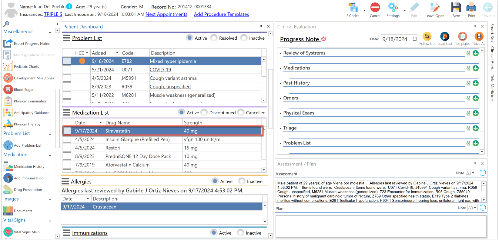 Mantenga actualizado el historial de medicamentos del paciente, para cumplir con las métricas de "Meaningful Use". Si el paciente no está tomando medicamentos, presione el botón de "No Known Drugs", para cumplir con la misma.