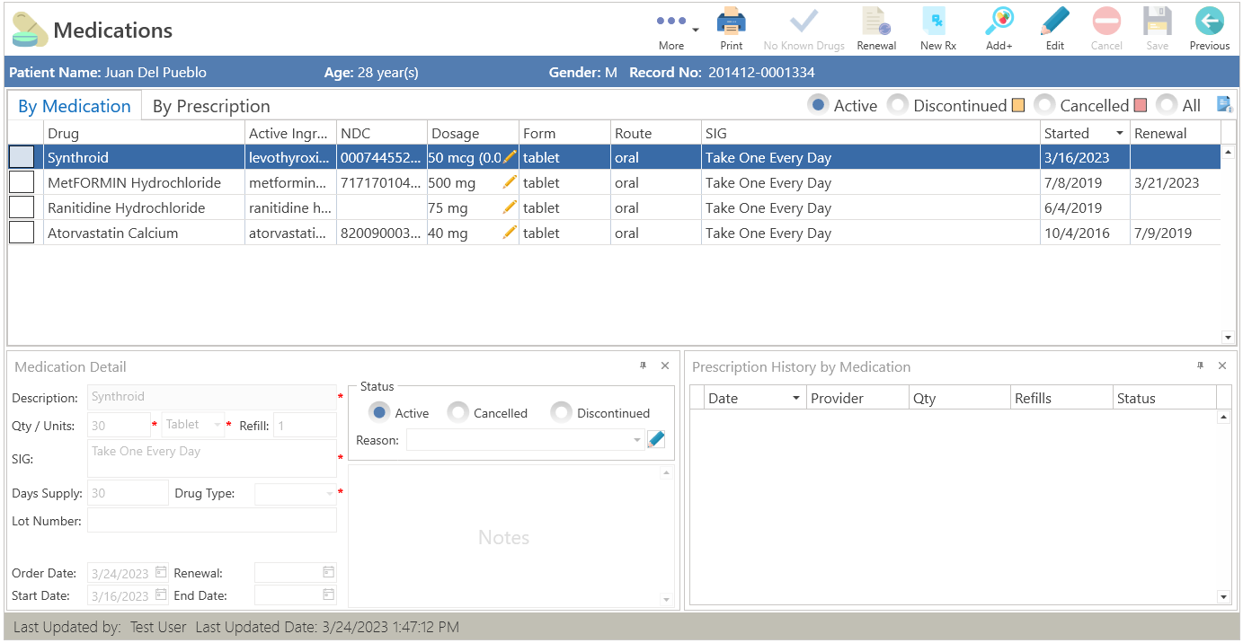 "Search", localizado en la parte superior izquierda de la pantalla y seleccione el botón de "Medication History". - Se desplegará la siguiente pantalla: