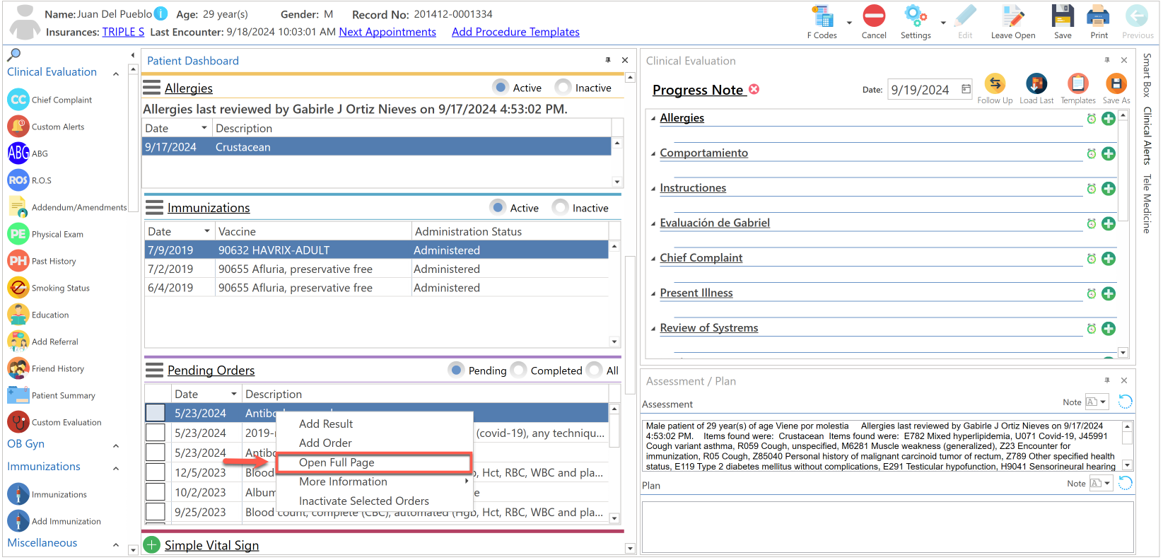- Presione el botón de "More", localizado al lado del enlace de "Pending Orders", en la sección del "Patient Dashboard" y seleccione la opción de "Open Full Page".