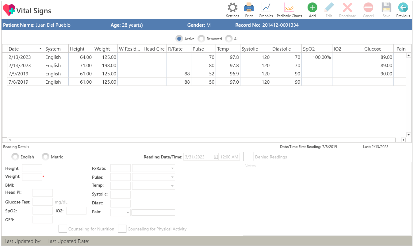 - Add: Allows adding vital signs.