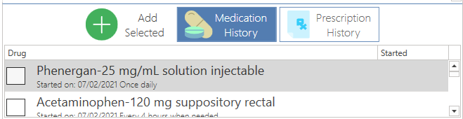 - Add Selected: Pressing this button will create a new prescription using the medication(s) selected in the Medications History section.