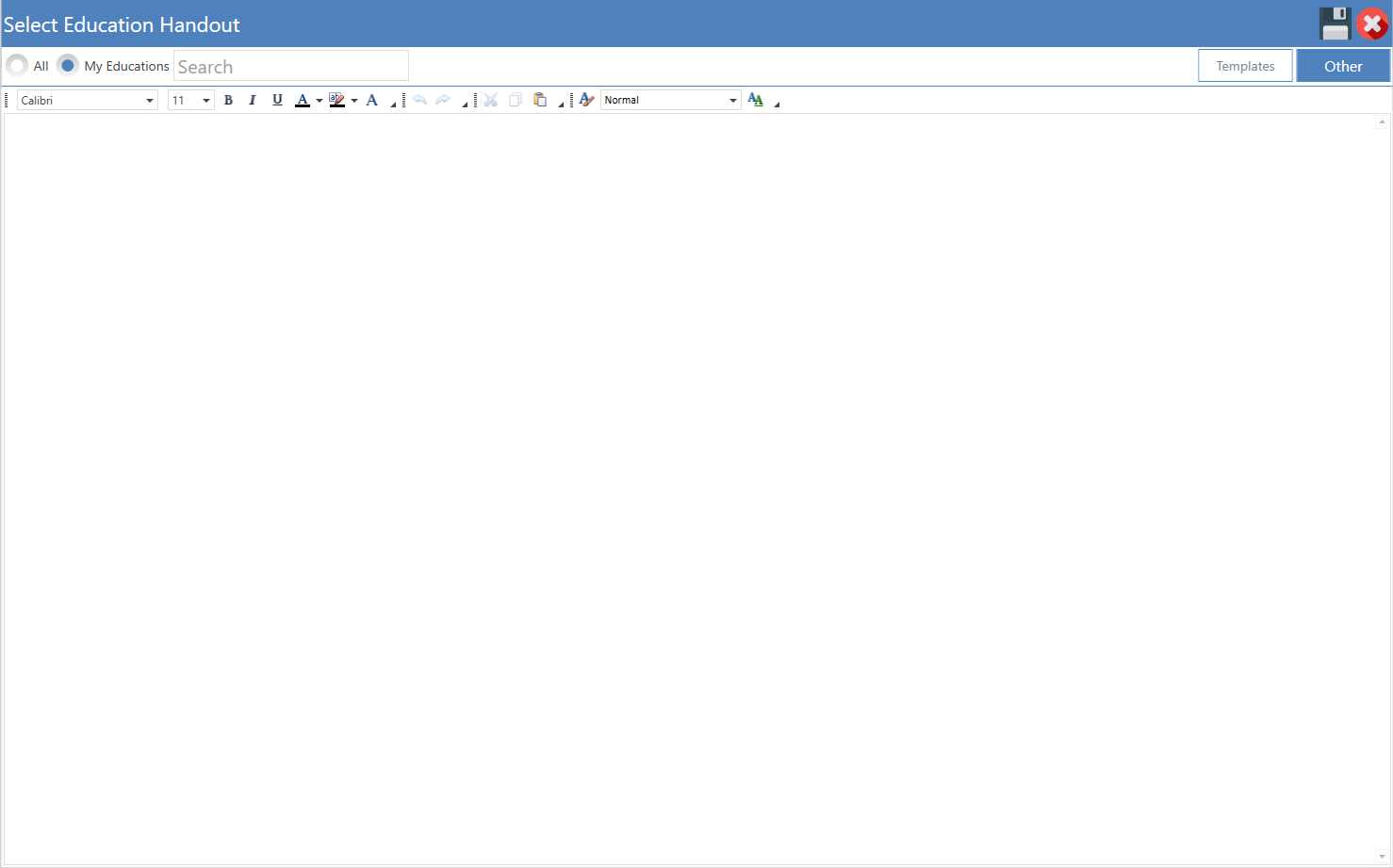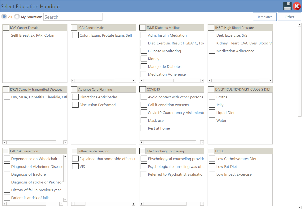 - Templates: To open education templates in the Settings module, navigate to Settings, select Clinical, and then Education Handouts. Click on the Templates button in the toolbar to access the templates.