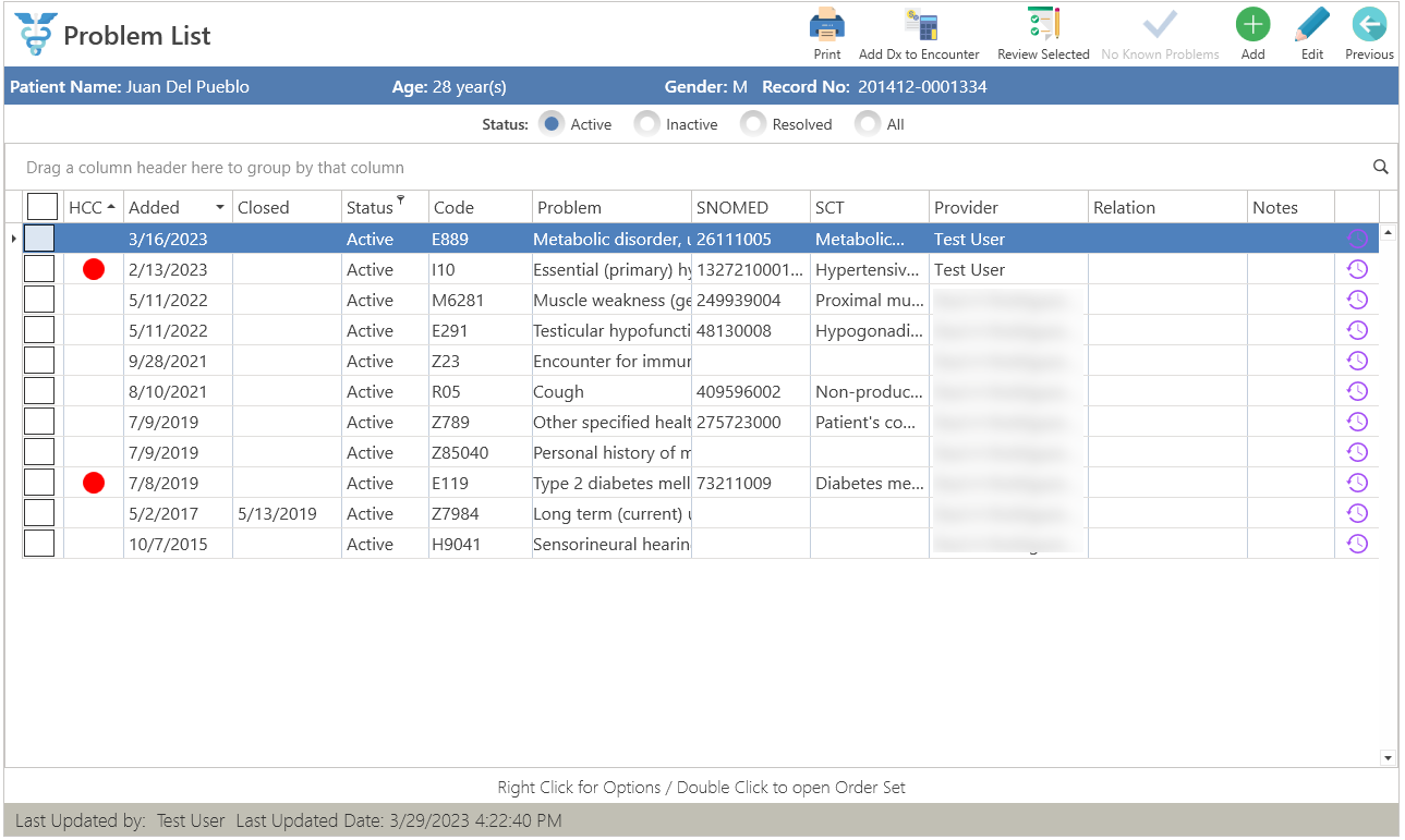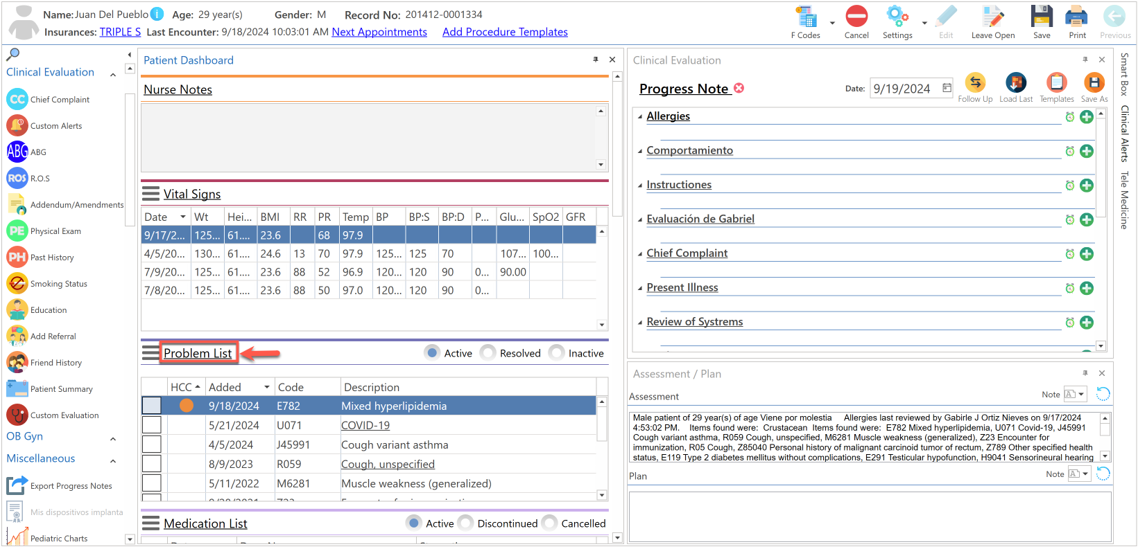 • Presione el texto de "Problem List", localizado en la sección del "Patient Dashboard".