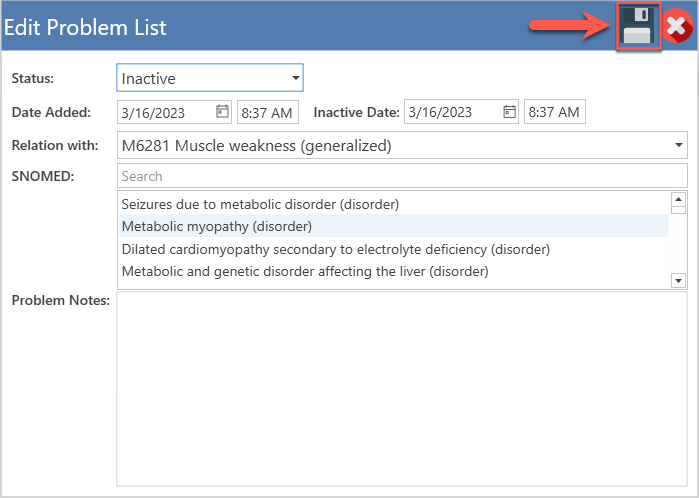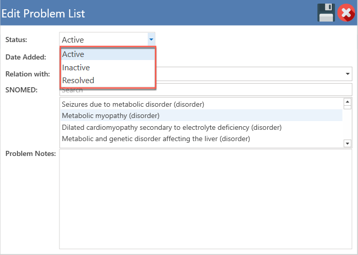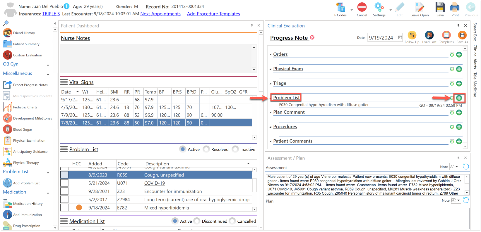 • Presione sobre el enlace de "Problem List", localizado en la sección de "Clinical Evaluation". O, presione el botón de "Add" en dicha sección. (Debe estar configurado en la pantalla de "Progress Notes Templates Settings".)