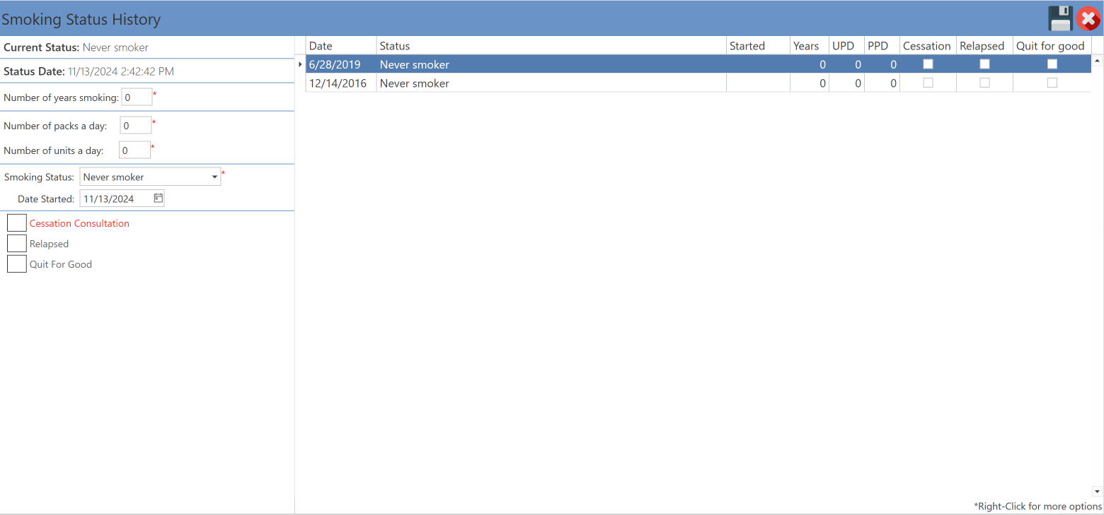 - Cessation Consultation [Y/N]: Al seleccionar, se está indicando que se orientó al paciente, sobre dejar de fumar. Esto acción ayuda a subir la medida de CQM (CMS135v3).