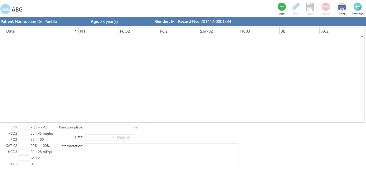 - Add: Permite agregar un nuevo registro de análisis de gases en sangre.