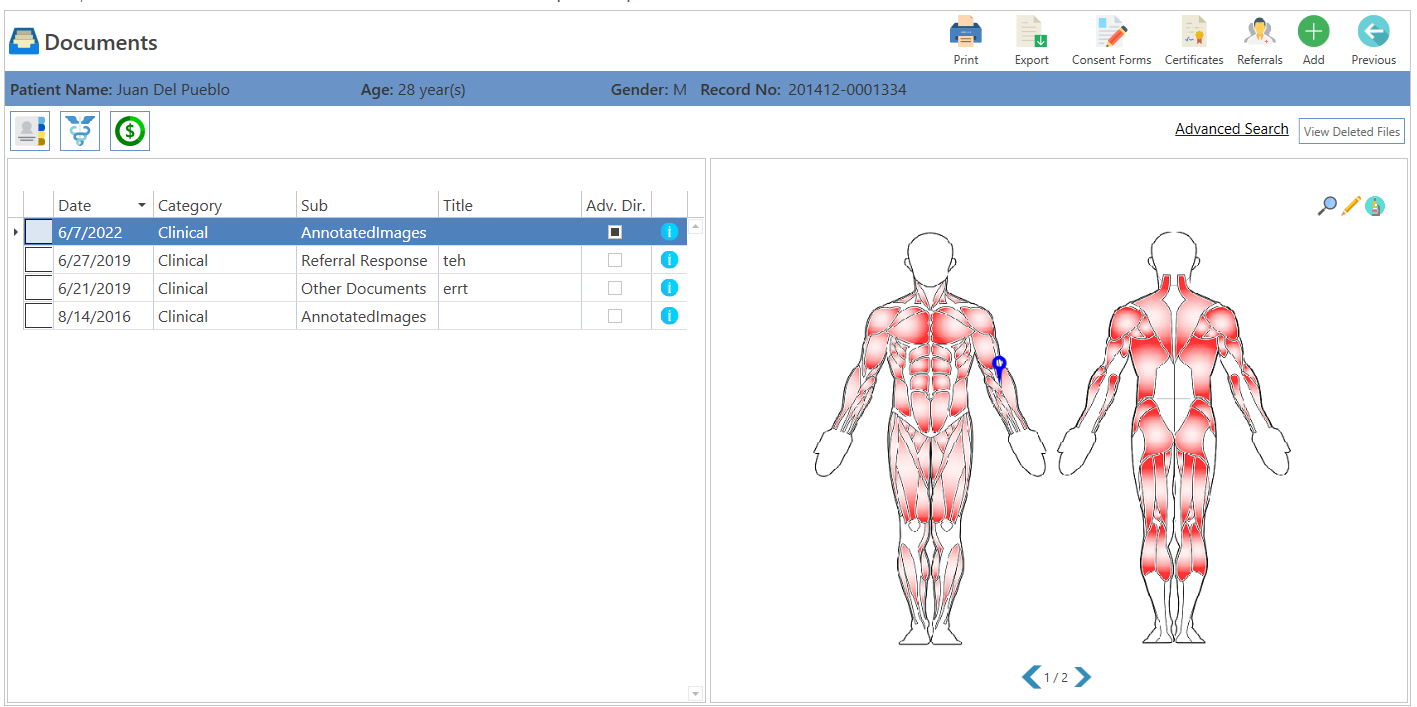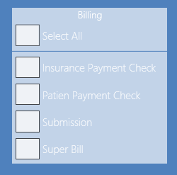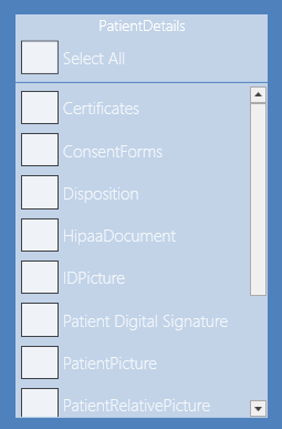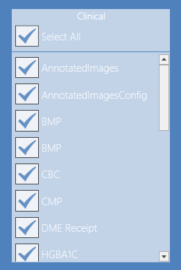 - Filter / Search bar: Filter the document types to be displayed: Patient Details, Clinical, and/or Billing.