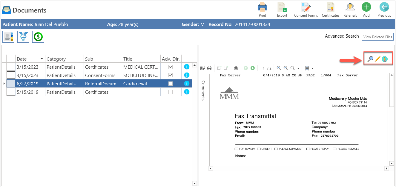 - Tabla: In this section, you can access all saved documents and images of the patient. These are organized into the following categories: Patient Details, Clinical, and Billing. To ensure that all documents and images are viewable, it is crucial that no filters are applied.