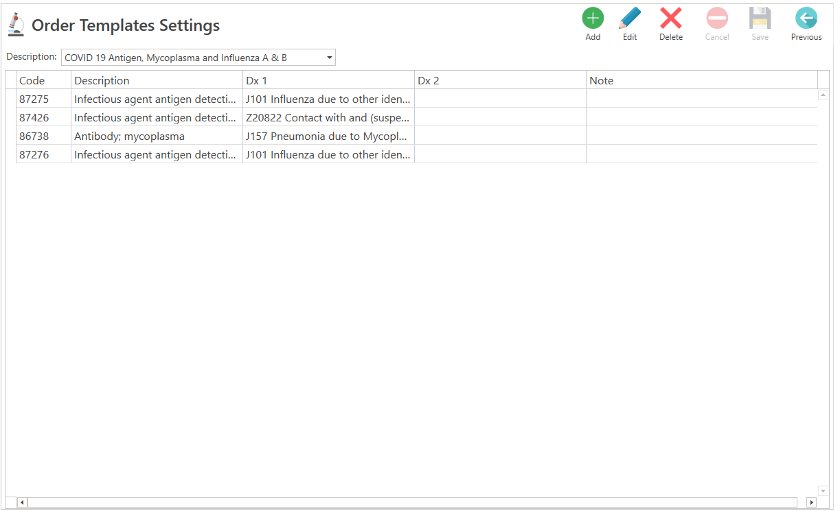 Order Template Details: Allows you to add one or two related diagnoses, with the laboratory ordered. You may also add a note.
