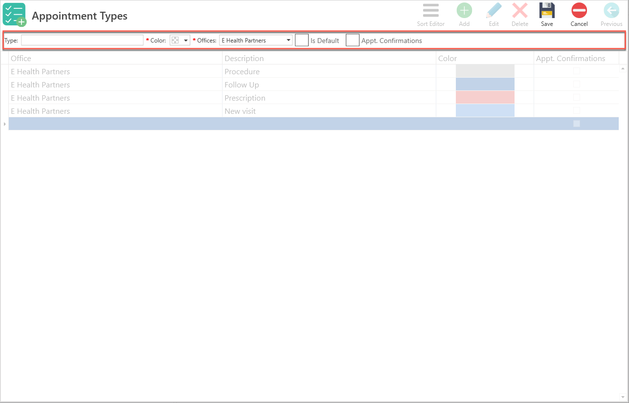 - Sort Editor: Allows you to sort the types of appointments, according to the preference of the office or center.